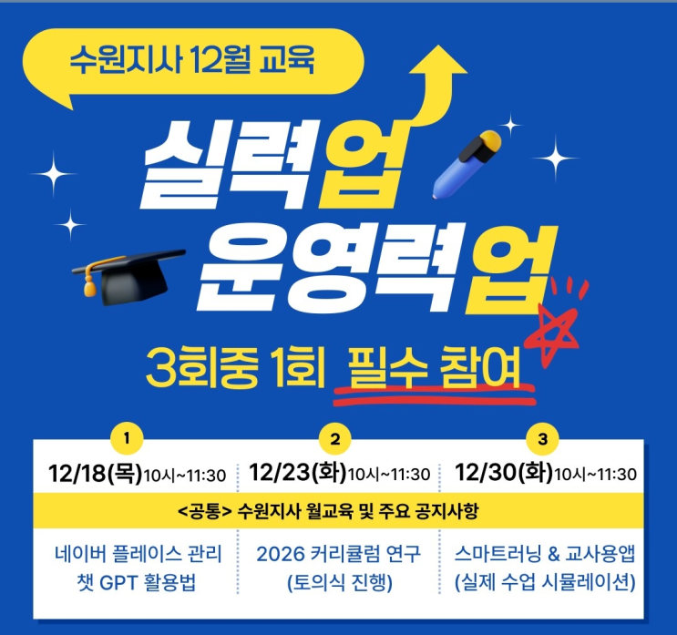 수원지사장님은 저희가 현장에서 더 잘 가르칠 수 있도록 실력 향상을 위한 다양한 교육 활동을 정말 꾸준히 진행해 주세요. 단순히 형식적인 교육이 아니라, 실제 수업에 바로 적용할 수 있는 내용들이라 항상 도움이 많이 됩니다. 특히 좋았던 건 원장님들 각자의 상황과 고민을 잘 이해해 주시고, 필요한 부분은 아낌없이 지원해 주신다는 점이에요. 교육 자료부터 운영에 필요한 부분까지 신경 써주십니다. 혼자 학원을 운영하다 보면 방향 잡기 어려울 때도 있는데, 수원지사 덕분에 든든하게 중심을 잡고 갈 수 있는 느낌이에요. 원장님들이 성장해야 학원도, 아이들도 함께 성장한다는 걸 몸소 보여주시는 분이라 늘 감사한 마음입니....... <img src="https://blogthumb.pstatic.net/MjAyNTEyMTlfMjE3/MDAxNzY2MTAwMjM3NTI4.CRmyVTUhyAOJjcm-Q_eh7WpFuNtVuPzVxYTe19m2WfEg.7iTYLY2vNwkigi4KXoHdBbunNbcUqbpNi5qXjKyfSsAg.PNG/image.png?type=s3" />