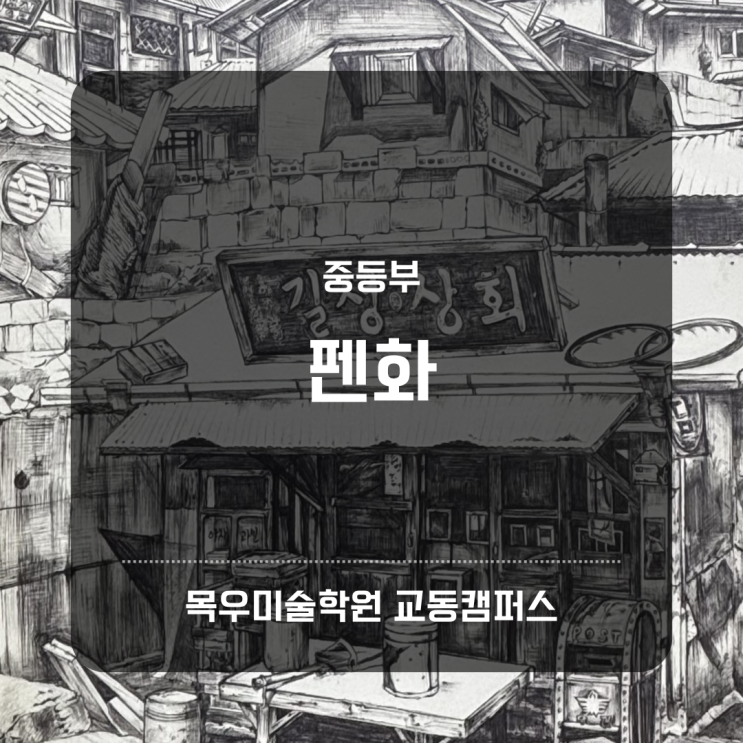 안녕하세요 수원미술학원 목우 교동캠퍼스 승옥쌤 입니다! 오늘은 중등부 친구들이 진행한 수업 중 펜화에 대해서 소개해드리려구하는데요. 볼펜 단일 재료만으로 선의 강약, 두께 조절 등을 통해 명암을 표현하는 독특하고 매력있는 그림이죠! 우리 중등부 친구들이 각기 다 다른 풍경으로 다양한 매력을 가진 펜화 수업이 되었답니다~ 다양한 수업작 중 학생작 일부를 소개해드릴게요! 골목 안 작은 책방의 풍경 골목 안에 조용히 자리 잡은 헌책방을 펜화로 표현해줬는데요. 그림에서 오래된 책방 특유의 분위기가 물씬 느껴지지않나요? 검은 펜의 선만으로 서점 속 책들의 디테일부터.. 벽의 거친느낌까지! 일상 속에서 그냥 지나칠 수 있는....... <img src="https://blogthumb.pstatic.net/MjAyNTEyMTlfMjM4/MDAxNzY2MTIxOTQyNjM5.qi1ryAjn8Mm3l_ed6NyobwbqMVRMUZwgvMLG7FWI94og.LKkXtYHwiCFu1SHNQ0F0WQ60snD4u8M1uU0Li1DCHh8g.PNG/%BA%ED%B7%CE%B1%D7%B4%EB%C7%A5%BB%E7%C1%F8_%281%29.png?type=s3" />