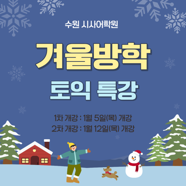 안녕하세요 수원 토익학원 수원 시사어학원입니다~! 벌써 토익의 계절이 왔습니다! 이번 겨울 수원시사어학원에서 토익 공부 하면서 보람 차게 보내시는거 어떠신가요? 그럼 지금바로 1월/2월 토익 수업 안내해드리겠습니다!!! 왕기초반(4주/8주) 왕기초반 ◆ 09:00 ~ 10:50 (4주/8주) ※ 4주반은 매일반으로 한달과정이며, 8주반은 주 3일반(월수금/화목금)으로 2달 과정입니다! 600+(4주/8주) 600+반 ◆ 10:00 ~ 13:10 (4주/8주) ◆ 14:30 ~ 17:40 (4주/8주) → 1월/2월에만 개강되는 반입니다! ◆ 18:50 ~ 22:00 (4주/8주) ※ 4주반은 매일반으로 한달과정이며, 8주반은 주 3일반(월수금/화목금)으로 2달 과정입니다! 토익 왕기초 ~ 650+(7주....... <img src="https://blogthumb.pstatic.net/MjAyNTEyMjBfNTkg/MDAxNzY2MTk1NzQ5OTg4.7vwbekKGmduMlkG4cUKC2B2hTAKHqCjsnOWX6O9cbxwg.qJUHXLzigx0WMtBVT8KYcu9jcybAbX3NS5rxDwYHLHEg.PNG/%C1%A6%B8%F1%C0%BB_%C0%D4%B7%C2%C7%D8%C1%D6%BC%BC%BF%E4.png?type=s3" />