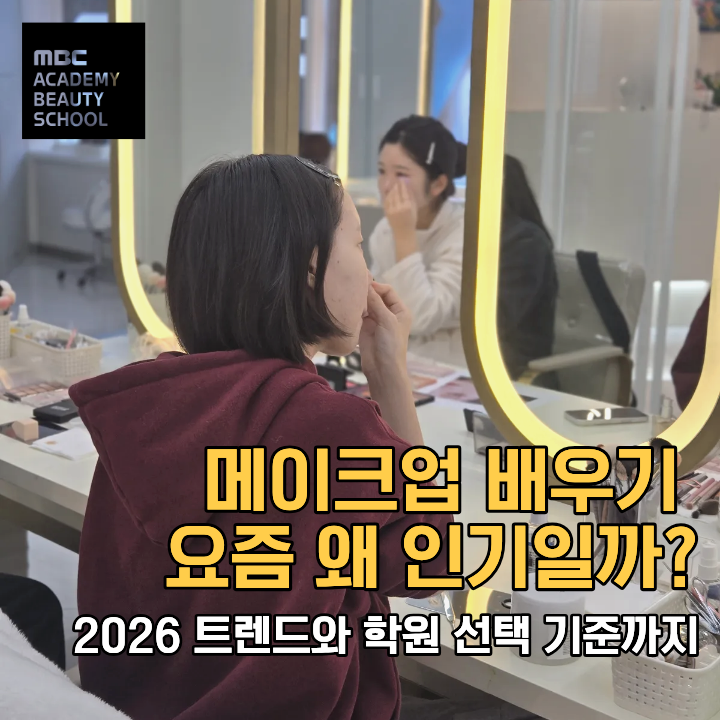 안녕하세요! MBC아카데미 뷰티학원 블로그지기입니다 요즘 메이크업은 단순히 외모를 꾸미는 기술을 넘어, 자기표현과 이미지 관리를 위한 중요한 요소가 되었는데요 SNS는 물론이고 일상, 업무 환경까지 메이크업이 주는 인상은 생각보다 크고, 그만큼 메이크업배우기에 대한 관심도 자연스럽게 높아졌어요. 그래서 최근에는 취미로 시작하더라도 체계적인 커리큘럼을 통해 메이크업을 배우려는 분들이 늘고 있는데요 2026년의 메이크업 트렌드와 학원을 선택하는 기준까지! 상세히 알려드릴게요 2026 메이크업 트렌드 2026년 메이크업 트렌드는 자연스러움, 개성 표현, 컬러 포인트의 조화에요! ✔ 자연스러운 베이스 표현 과하지....... <img src="https://blogthumb.pstatic.net/MjAyNTEyMjJfNjUg/MDAxNzY2NDAxNjIzNDA2._5MHRnqVKQlUthdOUkghsBbnH4J6UyTlrbnyQHB8RMYg.wLneXxN2S0VFcCaqfftcd85PwHpUgEFcFEpfmlU1vTwg.PNG/MBC%BA%E4%C6%BC_%B8%DE%C0%CC%C5%A9%BE%F7%B9%E8%BF%EC%B1%E2.png?type=s3" />