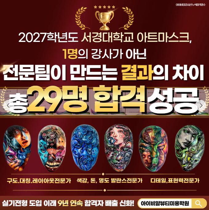 경기 수원시 매산로11 MG서수원빌딩 5층 아이비알뷰티아카데미 031-306-3217 예슬쌤❤ INSTA ; ibr_yss https://open.kakao.com/o/sfgxW6Ud 아이비알뷰티아카데미, 합격의 기준을 높이다! 아트마스크 총 29명 합격!! 안녕하세요 아이비알뷰티아카데미 예슬쌤입니다! 오늘은 서경대학교 메이크업학과 꽃 아트마스크 실기관련 내용 포스팅으로 찾아왔습니다 :) 이번에도 저희가 합격생을 배출하여 9년 연속 합격자를 배출하였는데요! 과연 합격 비법이 무엇인지 파헤쳐보러 가볼까요! 우선 수원지점 단일지점에서만 최종합격 3명이 나왔답니다 1차 아트마스크 합격한 수강생들도 있었지만 아쉽게 최종합격 떨어진 수강생들도 몇몇 있엇지만 2차 실....... <img src="https://blogthumb.pstatic.net/MjAyNTEyMjNfMTA4/MDAxNzY2NDcyNDQyOTcz.EyGNOqe0JHu0vyifj0RJXzmk3c12pnJmMpJ14mGpnTog.zRLGOnt_P98vcqxTyhy-bnPNGUl15v8N7o0rYGiW7ncg.PNG/KakaoTalk_20251212_175812567.png?type=s3" />