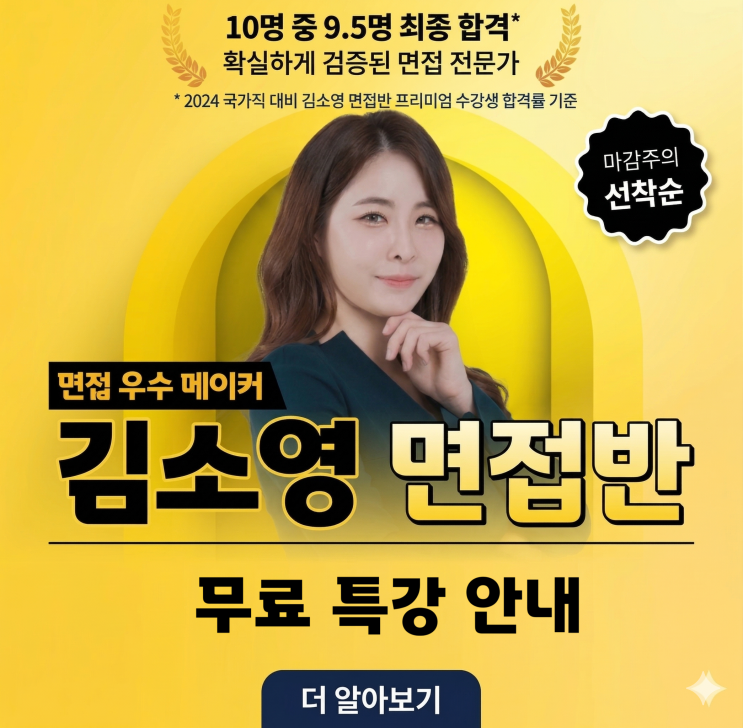 국가직 9급 필기시험을 치른 후, "이제 면접은 어떻게 하지?"라며 막막해하고 계신가요? 면접 준비의 첫 단추를 제대로 끼우고 싶은 분들을 위해, 에듀윌이 준비한 김소영 면접반 무료특강의 특별한 장점을 소개합니다. 왜 김소영 무료특강이어야 할까요? 단순히 학원 홍보를 듣는 시간이 아닙니다. 수험생들이 가장 궁금해하는 실전 합격 전략을 아낌없이 공개합니다. 1. 단 2시간 만에 끝내는 면접 가이드 방대한 면접 준비 범위 중 무엇이 중요하고 무엇을 버려야 할지, 우선순위를 확실히 정해드립니다. 시간 낭비 없이 효율적인 공부 방향을 잡을 수 있습니다. 2. 면접은 '감'이 아니라 '지식과 구조' 말주변....... <img src="https://blogthumb.pstatic.net/MjAyNjA0MDdfMTY3/MDAxNzc1NTU4MzgxMDk3.6_Y8sDxXCnMJJD4I9z3yIg8Q8AsYVhG8FBt3FttSQrsg.iN9NjEx-EyxvC1KA3QZT672E2IcCshiG9X_gX_Rg2Ukg.PNG/Gemini_Generated_Image_ph0zaqph0zaqph0z.png?type=s3" />