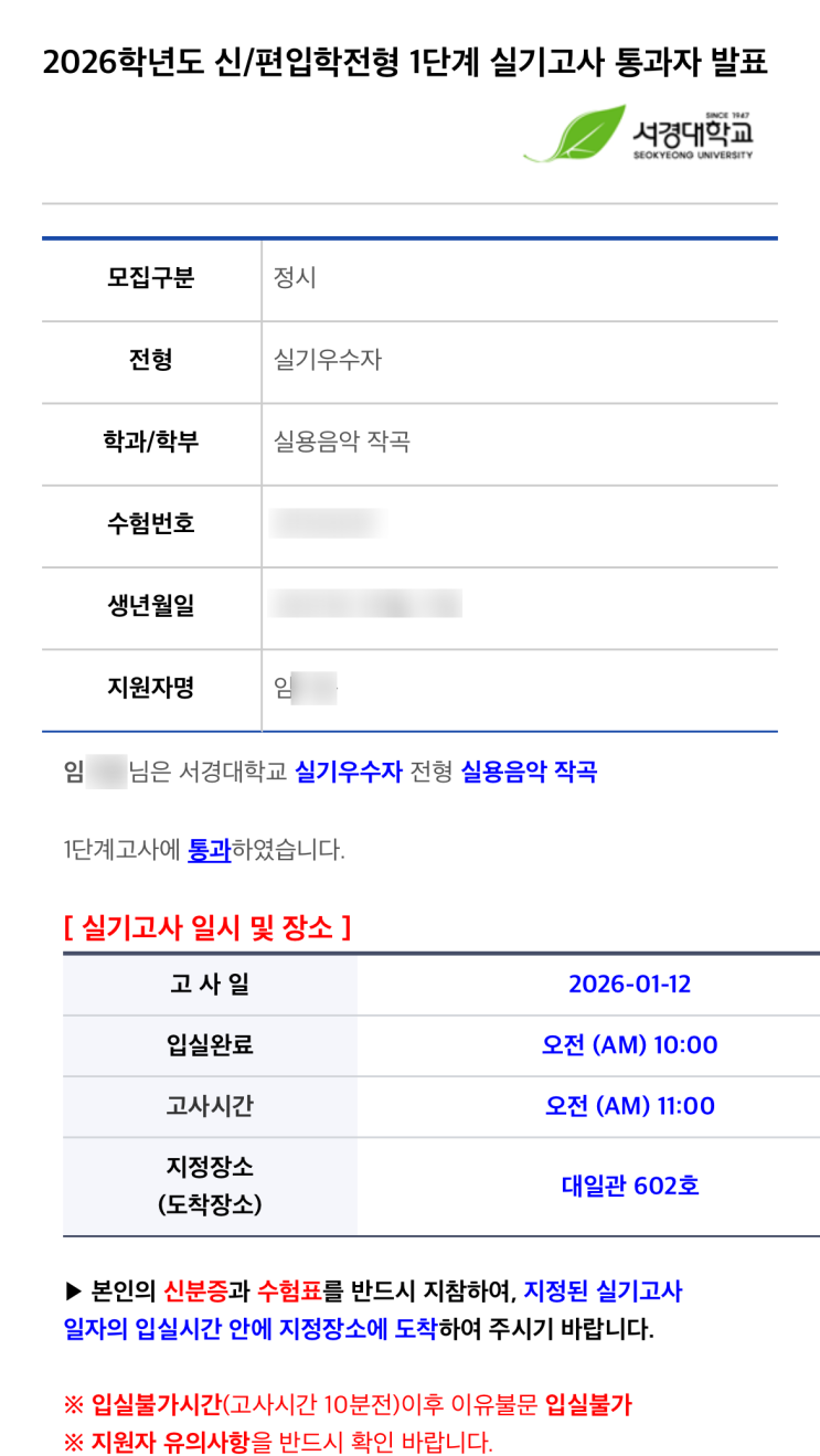 소복소복 내리는 눈 길을 뚫고 오늘 서경대 2차 시험을 보러 다녀온 녀석! 급하게 정시 준비하느라 곡도 다시 쓰고, 초견도 쌤 스타일로 다시 준비 해야하서 처음엔 걱정했지만 그 걱정이 무색하게 넘넘 잘 소화해주고 있어서 기특해!!! 남은 시험들 마음 불안하지 않고 자신감있게 잘 보고 올 수 있도록 하자~ ⭐원뮤직과 함께한 합격생⭐ ⭐원뮤직 작곡전공 입시간담회⭐ ✨원뮤직아카데미✨ 작곡전문실용음악학원 작곡/싱어송라이터/미디/기타/재즈피아노/보컬 레슨문의 ✨원뮤직아카데미 위치✨ <img src="https://blogthumb.pstatic.net/MjAyNjAxMTJfMTI4/MDAxNzY4MTk5ODE3NDk3.Ah86DS6vTgU9sv2IEGML9YHHps3dK1DcRZcHqeasrjIg.WZ9F6G_c74G9wkKbiw0GunuWJ-7aySg6ckH2qP_qlcUg.PNG/KakaoTalk_20260110_165938762.png?type=s3" />