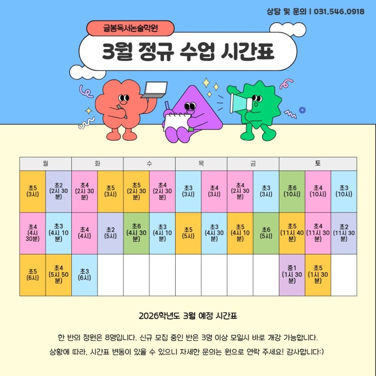 안녕하세요. 글봄독서논술학원입니다. 2026학년도 새학년을 맞이하여 일부 시간표가 변동되어 안내드립니다. 상황에 따라, 시간표 변동이 있을 수 있으니 자세한 문의는 원으로 연락주시면 감사하겠습니다. ※교육 상담 및 문의 : 031 - 546 - 0918 <img src="https://blogthumb.pstatic.net/MjAyNjAyMTFfMzIg/MDAxNzcwODAyMjUzMDQ2.IG5cJhQqgXr64p_Sr9r6OOlEnEnlNz4Buhx3AURiVywg.VK-t3WXzD-DuvgD1gNw47bMejVG3M-O1dMlYmkztPNEg.JPEG/2026%B3%E2_3%BF%F9_%BF%B9%C1%A4_%BD%C3%B0%A3%C7%A5.jpg?type=s3" />