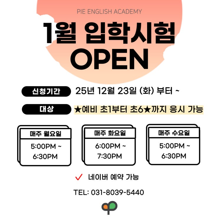 안녕하세요. PIE어학원 입니다. 2026년 1월 입학시험 신청 안내드립니다. ★예비 초1부터 신청 가능합니다★ 1월 입학시험 OPEN 1월 입학시험 신청은 25년 12월 23일 화요일 부터 신청이 가능합니다. ★예비 초1 신청 가능★ 예비 초1학년~6학년 까지 신청 가능합니다. ※ 인원이 제한되어 선착순 조기 마감이 될 수 있으며 마감 후에 신청하시는 분들은 대기 번호를 받게 되십니다. 취소를 희망하시는 분들은 대기자 분들을 위해 빠른 취소 부탁드립니다. 시험 일정은 매주 월요일 오후 5시 ~ 6시30분 매주 화요일 오후 6시 ~ 7시30분 매주 수요일 오후 5시 ~ 6시30분 으로 진행 될 예정입니다. *1차는 필기 시험으로 진행됩니다. →Vocabul....... <img src="https://blogthumb.pstatic.net/MjAyNTEyMjNfMTY4/MDAxNzY2NDY3MTMxNDgw.7wS8wm6u1nGD0lCZkeSj-0Y4V6lbFgGMwMvekrdtVBcg.NK9KsSLcv_2woUwh4_CwPwy_qFhEBggEOdgKptcg2Qog.JPEG/2026-%C0%D4%C7%D0%BD%C3%C7%E8-OPEN-001.jpg?type=s3" />