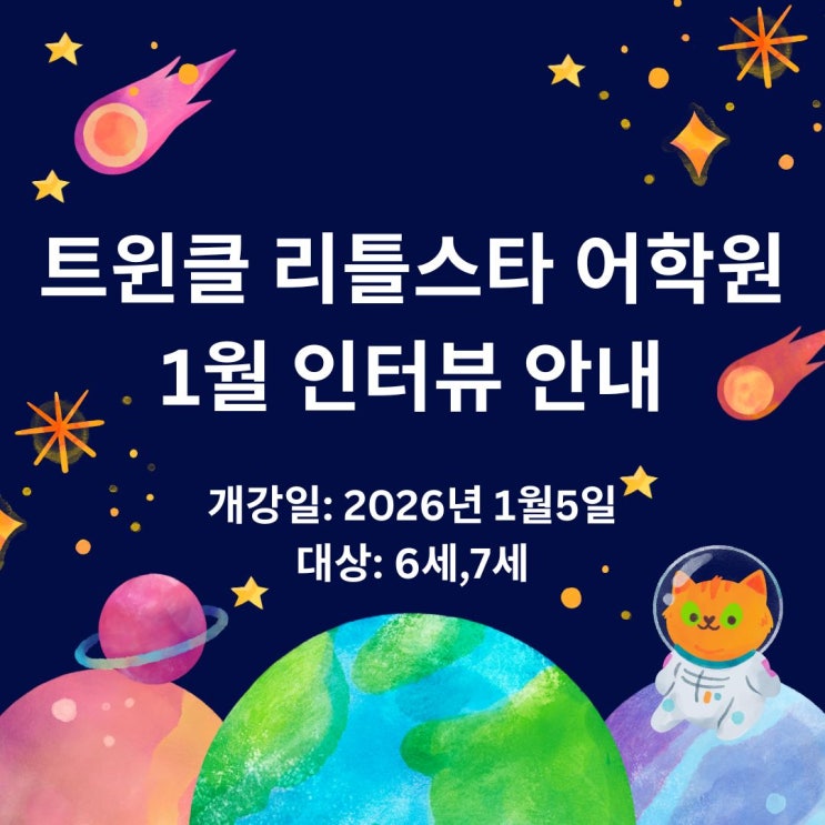 안녕하세요~! 트윈클 리틀스타 어학원입니다. 트윈클 리틀스타 어학원에서는 2026학년도 6세반, 7세반을 모집을 위한 인터뷰를 진행합니다^^ Filling Minds with wonder~ 트윈클 리틀스타 어학원에서 트윈클 매직의 주인공이 되어보세요! 반짝이는 마법 속에서 배움의 즐거움을 만나볼 시간이에요. ✨ 트윈클 리틀스타 어학원 1:1 인터뷰 예약 링크 바로가기 ▼ 등록은 선착순으로 진행되며, 정원 마감 후에는 대기 리스트로 안내됩니다. 트윈클 리틀스타 어학원에 관심 있으시다면 지금 원으로 문의해 주세요 ※주차공간이 협소하오니, 대중교통을 이용해 주시기 바랍니다. ※상담/전화 가능시간은 평일 10:00~16:00 입니다 ☎ 031-77....... <img src="https://blogthumb.pstatic.net/MjAyNTEyMzBfOTIg/MDAxNzY3MDUxODYzNzE5.Tv8Z1pWrV1123k5aKg7OFJ8VCWK5CzaoPpLOCxWUsjMg.SFx1obJyCIph_iKvtcc6To9PQFmIfH9Lt_vJ4s_xk_4g.JPEG/Dark_Blue_Green_Illustrated_Space_Themed_Happy_Birthday_Instagram_Post_%281%29.jpg?type=s3" />