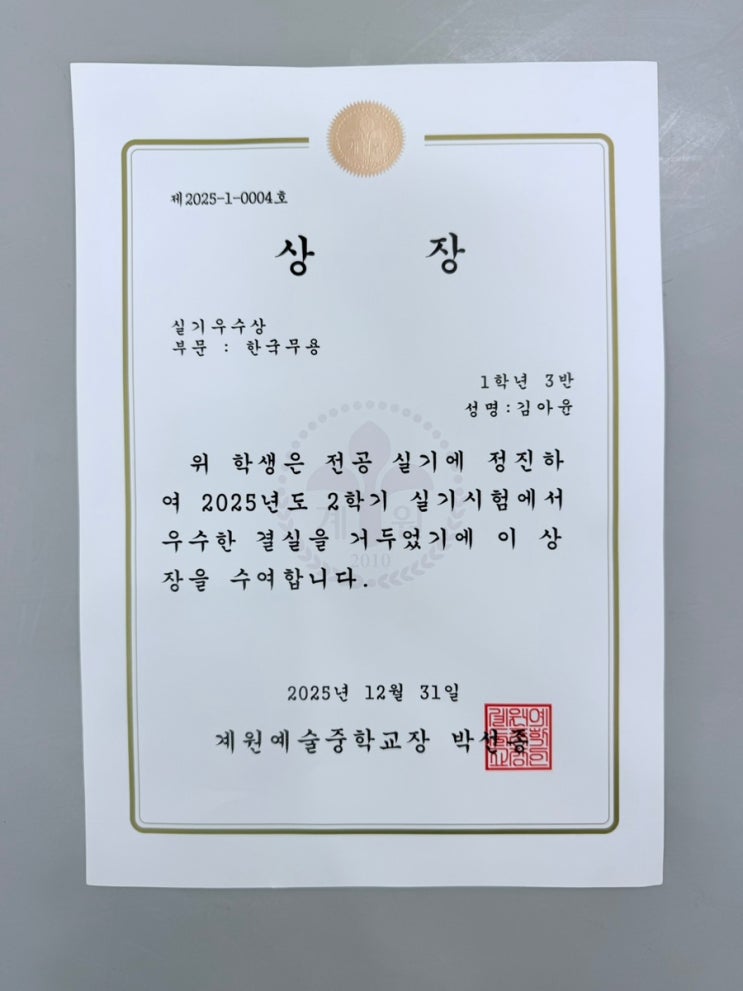 아윤이의 반짝이는 소식, 실기우수상! 새해~ 학원에 반가운 얼굴이 등장했습니다. 바로 우리 아윤이! 밝게 빵끗 웃으며 제게 뭔가 한 장을 건네주는데… “실기우수상” ✨ 세상에 이런 일이! 1학년 마지막 실기시험을 준비하느라 열심히 노력하던 우리 아윤이... 이렇게 멋진 결과를 보여주다니!(소정의 장학금도 함께 주어진다고 하네요, 소근소근) 아윤이의 성실함과 끈기가 만들어낸 값진 성과^^ 앞으로도 지치지 않고 꾸준히 나아가길, 그리고 더 큰 무대에서도 빛나길 진심으로 응원합니다. ⠀ 우리 아윤이, 화이팅! ⠀ ⠀ ⠀ ⠀ #판교한무 #분당한무 #한무입시 #합격 #입학 #계원예술중학교 #전원합격 #계원예술중학교합격 #IDT무용....... <img src="https://blogthumb.pstatic.net/MjAyNjAxMDhfMjY1/MDAxNzY3ODYxMTc2Mjg2.YWbuNeaFcN4ZZ-6bDXuAu8EBZi6USIGqUfBxuDFXpLgg.qqYGSh_vx-YVpmY7dESjHOeUFZMgJYEqaLSpzpFzu3Eg.JPEG/IMG%A3%DF2139.jpg?type=s3" />