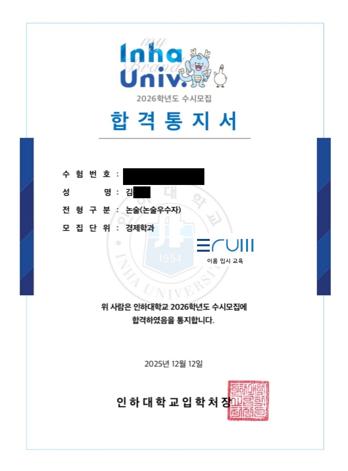 그렇기때문에 논술 전형에 대해 잘 아는 것이 우선 필요하다는 생각이 듭니다. 이룸 학원은 매년 모든 대학의 논술 수업이 진행되었고 계속해서 많은 대학에서 골고루 합격자를 배출하고 있었습니다. 인하대학교 경제학과 교과성적 : 3.5 논술 준비기간 : 11개월 전 연대에 다니고 있는 선배의 추천으로 이룸 논술 학원에 다니게 되었습니다. 이룸 학원에서 좋은 결과를 얻은 선배의 추천이었기에 저는 이룸 학원을 믿고 선택할 수 있었습니다. 1월부터 시작된 이룸학원에서의 수업은 학교에서 배울 수 있는 교과지식과 같은 수준이었지만 깊이가 조금 더 깊었습니다. 그냥 막연하게 알고있던 내용을 좀 더 정확히 이해할 수 있는 그런 수준이었....... <img src="https://blogthumb.pstatic.net/MjAyNjAyMDVfMTMx/MDAxNzcwMjcyMDk0ODky.854ChiGlqFO2QWLUsYcFOxoxieHWgM5r5jdnFVH9-eog.bQsG2tT529cgDFzBid9ZOtg0cb15rJ-rK0hpvnVSJqEg.JPEG/2026%C7%D0%B3%E2%B5%B5%C0%CC%B7%EB%B3%ED%BC%FA%C7%D5%B0%DD%C1%F5%BA%D0%B4%E7%B4%EB%C1%F8%B0%ED3%29-%C0%CE%C7%CF%B4%EB-%B0%E6%C1%A6%C7%D0%B0%FA.jpg?type=s3" />