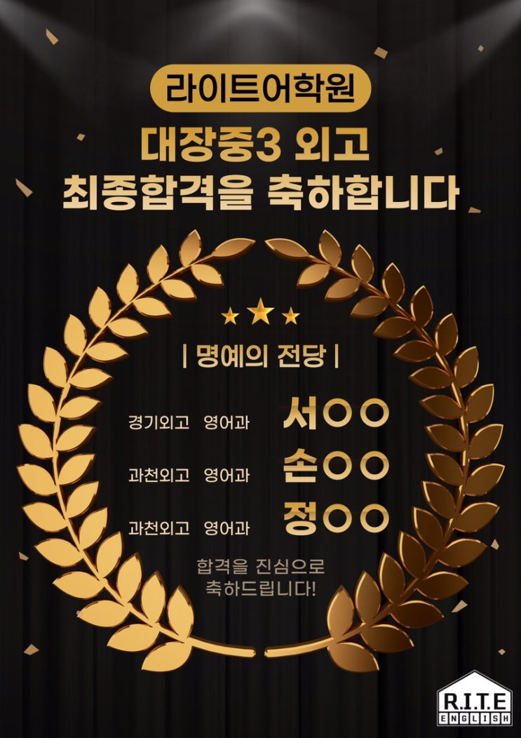 안녕하세요. 라이트 어학원입니다. 오늘은 매우 기쁜 소식을 전해드립니다. 라이트 어학원 재학생 대장중 3학년 외고 지원자 3명 전원 합격이라는 값진 결과를 이루었습니다. 자랑스런 우리 친구들입니다~~ 서OO 경기외고 영어과 IB 손OO 과천외고 영어과 정OO 과천외고 영어과 이번 외고 합격생 3명 중 2명은 라이트 어학원 개원 초창기부터 함께한 학생들로, 초등학교 6학년부터 4년간 꾸준한 학습을 통해 영어 실력을 체계적으로 완성해 왔습니다. 라이트 어학원은 원어민 선생님의 언어 수업(Speaking, Writing)을 기반으로 하지만, 초고와 중등부는 좀 더 Academic 한 수업으로 진행하고 있습니다. 중등 내신 (누적 내신 평균 97점) 은 물론....... <img src="https://blogthumb.pstatic.net/MjAyNjAxMDRfMyAg/MDAxNzY3NTEwOTMzODQx.UVeImRW_QOV1H9XUsrNs1xpM0HvJ_SMSNBznXf6Vidog.tC1QAQnwJ6uuuRfB7H4V1Xcf7NQnLBJZj3Fxy0zazMAg.JPEG/%BF%DC%B0%ED%C3%E0%C7%CF_%C0%FC%B4%DC%C1%F6%BF%EB.jpg?type=s3" />