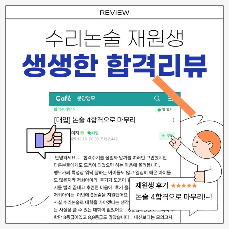 2026학년도 대입을 마무리하면서 아이들의 합격 소식을 듣는 것도 기쁜데 어머님들이 감사하게도 어머님들 커뮤니티에 후기를 올려주셔서 너무 기쁜 마음에 글을 씁니다. 합격 결과도 물론 감사하지만 그보다 더 감사하고 좋았던 건 수학을 설명할 수 있게 된 아이의 변화였습니다. 수리논술은 선택이 아니라 아이별 정확한 전략이 있어야 합격이 가능합니다. 분당 미금역 솔루션 수학 고등부는 강남 N 플러스 수리논술만의 특징!!! 수리논술 논술형 글쓰기 자체를 처음 접하는 학생들도 기초 개념부터 논리적 글쓰기 구조까지 차근차근 배웁니다. 초반에는 미적분·기하 등 논술 필수 개념 + 수리논술 글쓰기 기초를 다지고, 후반에는 대학별 기....... <img src="https://blogthumb.pstatic.net/MjAyNjAxMDdfNTcg/MDAxNzY3NzkyOTg5NTIy.J_NKkS6vOkNgMcGAzBnt_eAzrKN9FgjEX5QoFZ_6nLog.56CAsIa4BDkATS2Kpf9HneSNsGjlvU5m-oj6WlNQQh8g.JPEG/%C1%A6%B8%F1%C0%BB_%C0%D4%B7%C2%C7%D8%C1%D6%BC%BC%BF%E4._%2833%29.jpg?type=s3" />