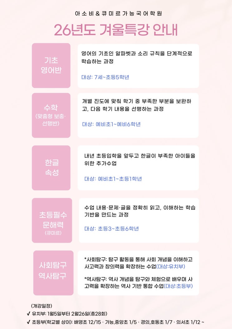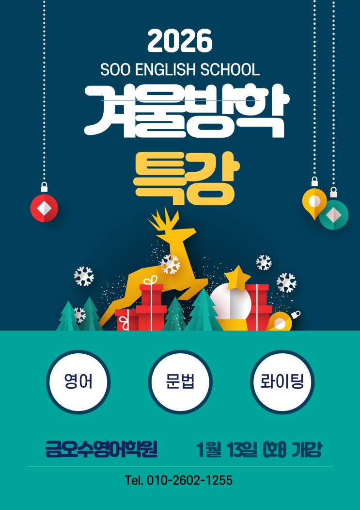 안녕하세요, 금오수영어학원 입니다. 다가오는 겨울방학을 맞아, 학생들의 영어실력을 한 단계 도약시킬 특별한 겨울방학 특강을 준비했습니다! *정원: 선착순 6명만 등록 가능합니다. (현재 신청자가 있어 일부 자리가 마감되었습니다.) * 고민 중이시라면: 레벨 테스트 받아보시고 자세한 상담을 진행해 보세요! 상담만으로도 늦지 않습니다. 예비중학교 특강안내 예비중2 특강안내 금오수영어학원 겨울방학 특강으로 다음 학기 영어 자신감을 가지고 시작하세요! 겨울 방학 특강 상담 신청방법 금오수영어학원 0.1.0 2.6.0.2 1.2.5.5(전화연결) ※ 부재 시, 수업 및 상담 중이오니 문자 남겨주시면 누락없이 순차적으로 회신드리겠습니다. <img src="https://blogthumb.pstatic.net/MjAyNTEyMTVfMTE3/MDAxNzY1NzU1NTc4Mjc5.sJxjImQU1g860f4VCpmwQUQqPZYadFhAvUKNry1kCYkg.AnQAX9JMiaw-_1SAyKw-UxZR_MuQMwsQRQf6VabnkQQg.JPEG/2026%B0%DC%BF%EF%C6%AF%B0%AD.jpg?type=s3" />