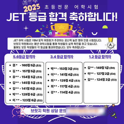 안녕하세요. 저희 브릿지 학원은 매년 어학 시험을 통해 학생들의 영어 실력을 향상 시키고, 정확한 실력 확인을 검증받고 있습니다. 횟수로 5번째 시험을 본 25년 JET 어학 시험! JET 시험은 한국 토익 위원회인 YBM 의 주관으로 시행되는 초등 학생을 위한 전문 어학 시험입니다. 공신력 있는 어학 시험이며, JET 어학 시험을 쭉 공부하면 성인 토익까지 연결이 됩니다! 그렇기 때문에 저희 학원은 학생들의 어학 실력 평가 뿐만 아니라, 다양한 경험과 목표 의식을 주고자 매년 어학시험을 진행중입니다. 올해는 9월부터 제트 시험 준비를 시작했습니다. 교재는 JET Planet을 선택했습니다. 각 파트별 문제 유형을 익히고, 중요 단어들과 표현....... <img src="https://blogthumb.pstatic.net/MjAyNTExMjdfMTQ1/MDAxNzY0MjM2MjA3OTMy.PZ8m_pgdsc8NvDVgucAgKm7J9PYQEc46t1m1zCJewd0g.cq7pAPUbM59qfIyP7zVRf1aAdn7W3Z274NkEDD7KkWsg.PNG/25%B3%E2_%C1%A6%C6%AE%BD%C3%C7%E8_%BC%BA%C0%FB.png?type=s3" />