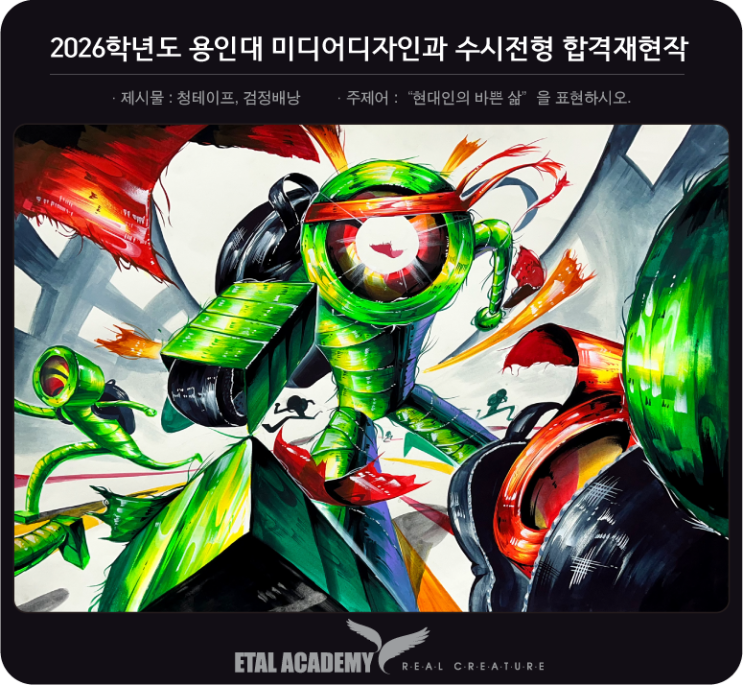 2026학년도 용인대 미디어디자인과 수시전형 합격재현작을 게재합니다. 이번 용인대 기초디자인 출제문제의 특징은 제시물과 함께 '공간감.리듬감.속도감'과 같은 단순 조형적 단어를 넘어서는 "발상적 표현"이 필요한 주제어가 제시된다는 것입니다. 경기대 기초디자인을 비롯한 여러대학이 이러한 출제성향을 보이고 있습니다. 단순히 학원에서 제시되는 고정된 몇개의 패턴에 껴맞추고 채색표현에 집중하는 수업스타일로는 이러한 출제경향에는 대응하기 어렵기 마련입니다. 실기장이나 대회에서 보면 어느 학원에서 왔구나를 한눈에 알아볼수있는 일률적인 그림은 창의적이어야 할 디자인관점에서 지양되어야 할 것 입니....... <img src="https://blogthumb.pstatic.net/MjAyNTEyMjNfMTc5/MDAxNzY2NDYwMDE0NDg4.1X2Gs7zcthdb9U_TEu8taCC5ux0_CG9zrp22tzKvN6Eg.hpKXt0kJuyhUvliqOiQpG52sPD45OEwwZnVZgYS5qRkg.PNG/2026_%BF%EB%C0%CE%B4%EB%C7%D5%B0%DD%C0%DB.png?type=s3" />