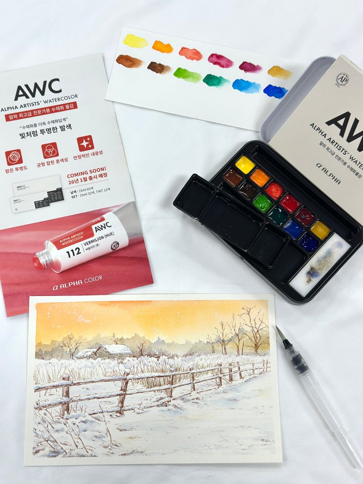알파에서 기존 알파골드 수채화제품을 기반으로 높은 투명도와 맑은 발색감을 구현하기 위해 연구 개발된 전문가용 수채화물감 라인이라고 합니다. 26년 1월에 AWC수채화물감으로 출시 예정이고 원래 15ML 튜브형 형태인데 체험단을 위해 휴대용 키트로 제작된 것 같습니다. 체험 제품 구성 AWC 수채화 12색 휴대용 팔레트, 물붓 알파 디자인 마커 & 브러쉬 마커 2입 틴케이스 뚜껑을 열면 휴대용 고체물감처럼 구성되어있습니다. 또한 물붓과 스펀지가 들어있어서 야외 작업이나 간단하게 수채화 사용시 편리할 것 같습니다. 같이 포함된 2개의 마커는 랜덤으로 색을 받게 됩니다. 고체물감의 느낌으로 칸마다 물감이 짜여져있고, 물붓과 스....... <img src="https://blogthumb.pstatic.net/MjAyNTEyMTVfMTEy/MDAxNzY1NzYzNTUzNjQw.rV6MLllfyufBy-AzeYFnP-DdsExkrVoGrL7yzk4lWbEg.5ho8R1CWqxz1-YBeKQ48IrOK-_nef8Ax6qcUd5g6v70g.JPEG/IMG_6394.JPG?type=s3" />