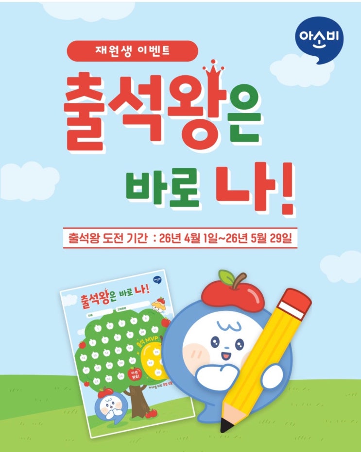 안녕하세요~ 유치~초2전문교육원 아소비 안양 호계학원입니다. 오늘 4월 1일(수)부터 재원생 이벤트가 시작됩니다. 출석왕은 바로 나! 이벤트 기간 : 4월 1일~5월 29일 출석할 때마다 학원에서 스티커를 붙여줍니다. 공부도 열심히 하고! 경품 당첨의 기회까지 잡아볼까요? 매일매일 출석 체크하고 출석왕에 도전하세요! <img src="https://blogthumb.pstatic.net/MjAyNjA0MDFfMjcw/MDAxNzc1MDUzODk2Nzkw.PTKy3bPUU3LNjcH1-HM3HBGrpRchPJ7t7Kwr18oZFSsg.Q0u9WvUUDUb2lUq3EYcuVZBb4eCAUMuSEc3zNZov1G4g.JPEG/%C3%E2%BC%AE%BF%D51.jpg?type=s3" />