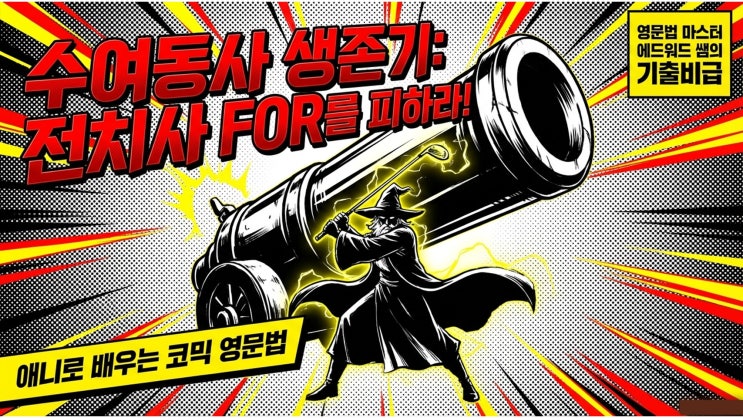 https://youtu.be/ZwmsSXmBJFA?si=crHn7wZLAA4vmEYM 4형식 문장을 3형식으로 바꿀 때는 '수여동사 + 직접목적어(D.O) + for + 간접목적어(I.O)'의 형태로 순서를 바꾸고 전치사를 추가해야 합니다. 자료에서는 특히 전치사 'for'를 사용하는 동사들을 쉽게 기억할 수 있도록 "MBC에서 GOLF 도(do)"라는 재미있는 암기법을 제시하고 있습니다. 전치사 'for'를 사용하는 구체적인 동사들은 다음과 같습니다: MBC: make, buy(Buy), build, cook GOLF: get, order, leave, find 도: do 노래 가사에서는 이 구조를 "뛰어 D O(직접목적어) 포(for)처럼 날아가는데, 맞아서 I O I O(간접목적어) 나죽....... <img src="https://blogthumb.pstatic.net/MjAyNjA0MDFfMjc1/MDAxNzc1MDI3ODE1OTA1.ouYvJOj-fr-hKIqZbuVJU7CCAqjDRqubBG8MEAZeddwg.oaMyn-_IQzDCMP9WlMMy9AzOTAQcU2PUdJrc5_zgmMMg.JPEG/%3F%8A%AC%3F%9D%BC%3F%9D%B4%3F%93%9C1.JPG?type=s3" />
