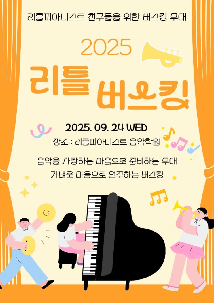 . 리틀 버스킹 데이 음악을 사랑하는 우리 리틀피아니스트 친구들을 위해 작은 버스킹 무대를 열어보았어요 :) 학원 안에 감성 가득한 가을 배경을 꾸미고 아이들이 무대에 선 것처럼 연주할 수 있도록 준비했답니다. 자유로운 곡 선정부터 듀오 파트너 연습까지 모든게 리틀 친구들 스스로 결정하여 참여한 [리틀 버스킹] 무대 ♡ . 리코더로 무대를 준비한 멋진 태인이부터~ . 드럼연주로 버스킹에 참여한 우리 우주까지~ 정말 즐거운 시간이였어요^^ . 연주가 끝난 후에는 친구들과 함께 맛있는 떡볶이 간식 타임️ 함께 웃고 이야기 나누며 음악만큼이나 즐거운 시간을 보냈답니다 :) . . 조금은 떨리지만, 용기 내어....... <img src="https://blogthumb.pstatic.net/MjAyNjAzMjlfMiAg/MDAxNzc0NzU1NDMzOTI5.65Mqu9DgiwdOwr1tzNvawWgA202BZSJcI3Ed2wy1Pjcg.gy_T9XC12BLUpeKy5_53yU0_qm7GKejU8ZTnVhxbjhog.JPEG/1757404884584.jpg?type=s3" />