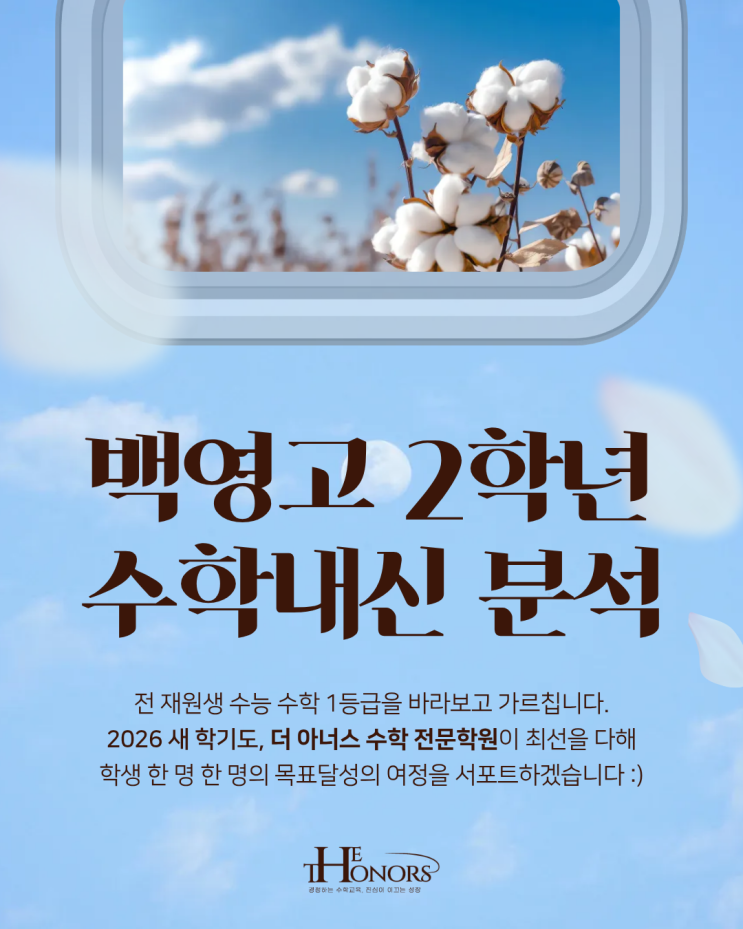 안녕하세요~! 학생에게 귀기울이는 '경청 시스템'과, 촘촘한 커리큘럼 & 꼼꼼한 관리로 수 많은 실력 상승 케이스를 만들어가고있는 평촌 중/고등 수학 전문 더 아너스 수학학원입니다^^ 백영고등학교는 비교적 출제 동향이 명확한 학교입니다. 출제 또한 학교 자료에서 대부분 나오는 편이기에 평소 학교수업 성실히 들으면서 제대로 준비하면 확실히 결과가 나옵니다^^ 오늘은 더아너스 수학 고등부 팀에서 분석한 백영고 2학년 내신 자료를 바탕으로 백영고2 수학 내신 출제 동향과 고득점 전략을 정리해드리겠습니다~! (※ 아래 내용은 학원 자체 분석 자료 기반입니다) 1. 전반적 난이도는 ‘상’, 하지만 체감은 다르게....... <img src="https://blogthumb.pstatic.net/MjAyNjAzMjlfMjcz/MDAxNzc0NzkyMzI2MjUy.w-9aI2Dne2l6OoJZXLEgEhv3mv8tIFdzvUr1wGWtmycg.Goyl3UHYuaaDOoCRyLC0zXcc-WP2Qf4Vs7wlFO7aer0g.PNG/4.png?type=s3" />