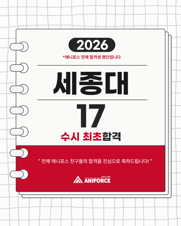 안녕하세요. 부천 애니포스 만화학원입니다. 2026학년도 세종대학교 만화애니메이션텍학과 수시 전형 결과가 드디어 공개되었습니다! 전체 애니포스 학생들 중 세종대 만화애니메이션텍학과 총 17명이 최초합격 소식을 전해주었습니다. 애니포스 만화학원 합격생 여러분, 축하드립니다. 전체 애니포스 만화학원 학생들의 2026학년도 세종대 만화애니메이션텍학과 수시 최초합격생 명단, 바로 확인해 보세요! #2026세종대수시합격 #세종대수시전체 #세종대학교수시합격 #세종대만화애니메이션텍학과 #세종대실기전형 #세종대실기고사 #세종대면접전형 #세종대합격자 #세종대입시준비 #세종대수시준비 #만화학원 #웹툰학원 #애니학원 #게임학원 #만....... <img src="https://blogthumb.pstatic.net/MjAyNTEyMjBfODAg/MDAxNzY2MjAyMjUzMzE0.iaffcUNMiOp4HEMcIjvA_NHzkVS6tVrbl7oHsMMI8CQg.r6uvwuwDRSHKE7kB4_w3pTtDhZXoBIZVxUCG8vXGSIYg.PNG/251212_2026_%BC%BC%C1%BE%B4%EB_%BC%F6%BD%C3_%C7%D5%B0%DD%BB%FD_%B8%ED%B4%DC_%281%29.png?type=s3" />