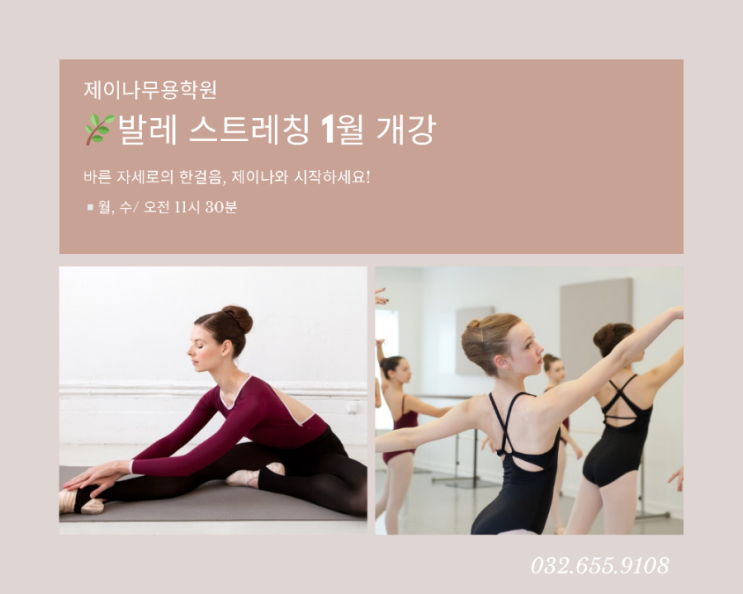 1월, 발레 스트레칭 개강!! ▫️월, 수/ 오전 11시 30분 1월, 발레 스트레칭 수업이 개강됩니다! 핸드폰, 태블릿에 장시간 앉은 자세에서 근무, 오랜시간 서서 계시는 분들. 점점 좋지 않은 자세로 굳어지고 있어요. 방학동안 아이와 함께도 좋아요! 오전시간동안 자세교정에 좋은 발레 스트레칭으로 좋지않은 자세로 굳어지지않도록 하루를 시작하세요. 바른자세로의 한 걸음, 제이나와 함께 시작하세요! 늦을 수록 내 몸은 아파해요. 문의 032.655.9108 카톡 J.Na_dance #부천 #발레스트레칭 #제이나무용학원 https://www.instagram.com/p/DSjkYnJD7Ka/?igsh=MWdwbWQyMWd0NDhjYw== <img src="https://blogthumb.pstatic.net/MjAyNTEyMjJfMTkg/MDAxNzY2Mzg1NTczMDU0.2Lkrs-gz3-roFqYMcFbdW6gkj2ah_sFgH_bOP2oIM-0g.7TQD5KYZvnNrLVYGpKhhdphsc9QMRU-gx0_j9-pbTggg.PNG/900%A3%DFOur_Ballet_Lessons_Have_Started_Photo_Collage%A3%DF20251222%A3%DF151951%A3%DF0000.png?type=s3" />