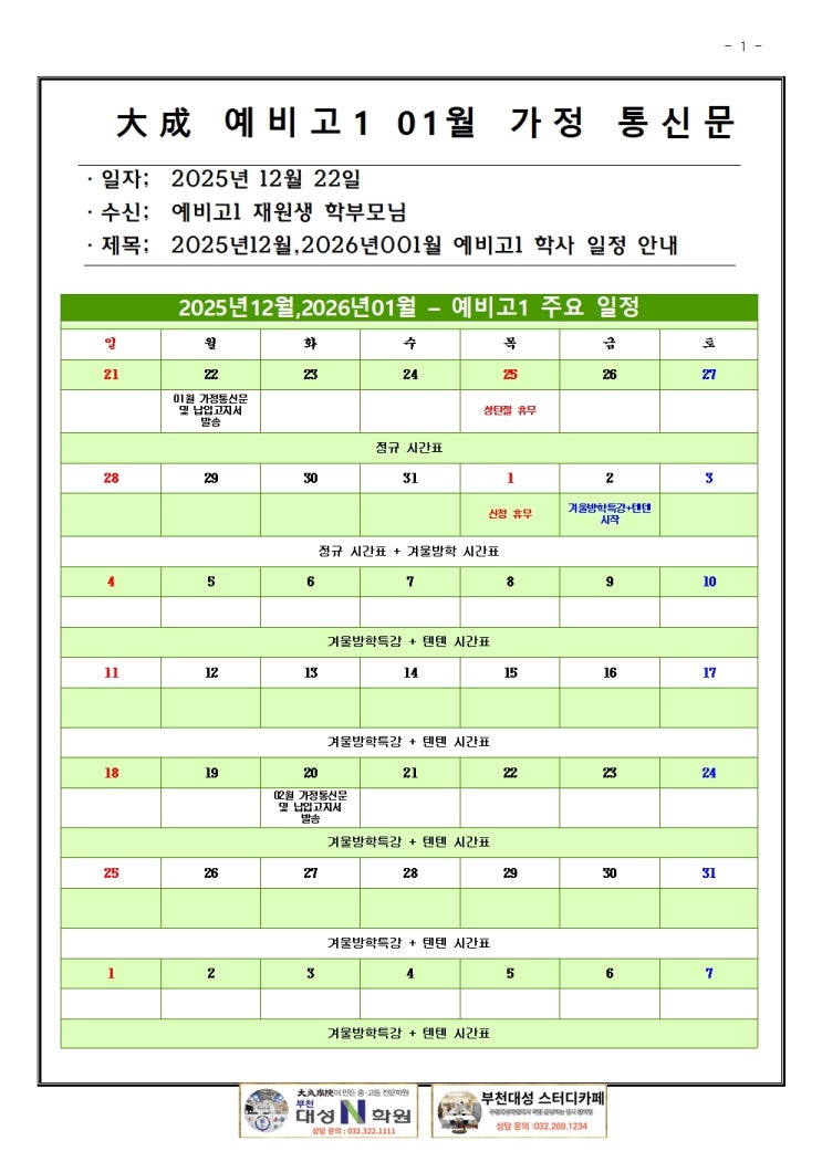 안녕하세요, 부천대성학원입니다. 고등학교 입학을 앞둔 지금, 중학교와는 차원이 다른 학습량과 난이도에 걱정이 많으실 학부모님과 학생들을 위해 '2026 예비고1 겨울방학 윈터스쿨 및 텐텐자습' 프로그램을 안내해 드립니다. 이번 겨울방학 2달은 고교 3년의 성적을 결정짓는 골든타임입니다. 부천대성학원이 준비한 빈틈없는 커리큘럼을 확인해 보세요! 1. 주요 일정 안내 (꼭 확인하세요!) 방학 시작과 함께 바로 학습 몰입 모드로 전환할 수 있도록 일정을 체크해 주세요. 1월 2일(금): 2026년 겨울방학 특강 및 텐텐자습 대개강! 12월 25일(목) 성탄절 / 1월 1일(목) 신정: 학원 휴무 1월 20일(화): 2월 가정통신문 및 납....... <img src="https://blogthumb.pstatic.net/MjAyNTEyMjJfNjAg/MDAxNzY2Mzc2MTc3OTcw.4i3fwb2KBuVJU-_cNTbJErfeG_pdoVrFSj0b9Iy7DH4g.2ZjTCwFIGcACM4g9jJqHnzICj5UBpaeGl0Iuw5EK9fIg.JPEG/2026%B3%E2001%BF%F9_%B0%A1%C1%A4%C5%EB%BD%C5%B9%AE%BF%B9%BA%F1%B0%ED1001.jpg?type=s3" />