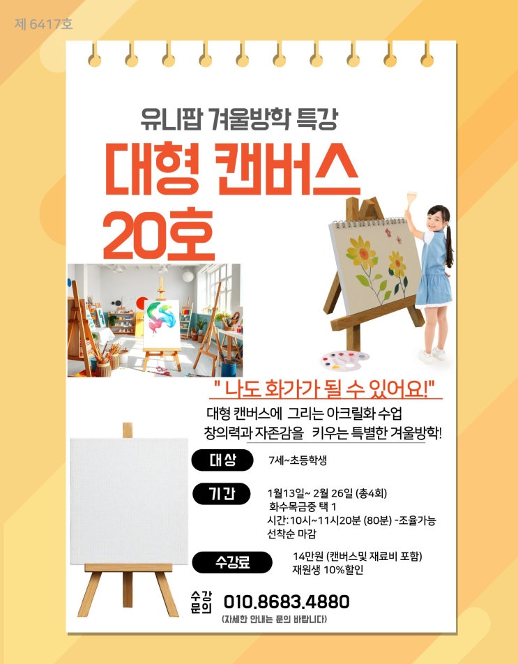 유니팝 겨울방학 특강 대형 캔버스 작품반 모집합니다! 긴 겨울방학이 다가오면서 아이들의 특강 프로그램을 고민하시는 부모님들이 많으실 텐데요. 겨울방학을 맞아 아이들이 스스로 한 작품을 완성하는 경험을 할 수 있는 특별한 프로그램을 준비 했습니다. ✔️아이의 표현력을 활짝 펼치는 시간 ✔️ 작은 종이에 갇혀있던 상상력의 해방 ✔️ 공간 감각과 구성력의 발달 ✔️ 성취감의 크기가 다르다 ✔️ 프로젝트 경험 구상부터 밑그림, 채색, 디테일 작업까지 단계별로 진행하면서 아이들은 '과정'의 중요성을 배웁니다. 이번 겨울방학, 아이에게 큰 꿈을 그릴 수 있는 큰 캔버스를 선물해보시는 건 어떨까요? 작은 붓....... <img src="https://blogthumb.pstatic.net/MjAyNTEyMjNfMjI1/MDAxNzY2NDk1MDg3MDU3.n5yQTX8xu1TXLTE6NMtzrKmN0kcF7YRNlAYQh_tAYSAg.6WN4_xAxVlo1t4nZaj7GWx9LBGqYIzK0EbgaSrWe4cEg.JPEG/KakaoTalk_20251217_233515964.jpg?type=s3" />