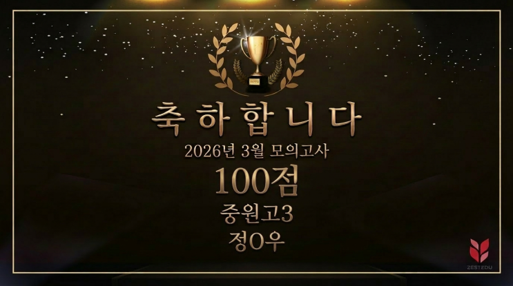안녕하세요! 최상위권의 클래스 "시험에 강한 1등학원" 제스트에듀입니다. 2026년 3월 제스트에듀 학력평가 결과 중원고3 정ㅇ우 1등급 (100점) 중원고2 박ㅇ영 1등급 (98점) 중원고1 손ㅇ은 1등급 (96점) 중원고1 유ㅇ 1등급 (95점) 중원고1 이ㅇ민 1등급 (95점) 중원고1 이ㅇ윤 1등급 (95점) 중원고3 김ㅇ연 1등급 (92점) 중원고3 노ㅇ희 1등급 (91점) 상일고1 김ㅇ후 1등급 (90점) <img src="https://blogthumb.pstatic.net/MjAyNjA0MDZfNTAg/MDAxNzc1NDc3NDAwOTk5.eOz-hSSukqHFvX3k8SJA_jYqz-oxCrksOqXIZuRGLysg.PhALiI-00IJy6XvFRk-_qE5Y_B9NC_KOwzMDluJufTcg.PNG/26%B3%E2_3%BF%F9_%C7%D0%B7%C2%C6%F2%B0%A1_%BB%F3%C0%E5_-_%C1%DF%BF%F8%B0%ED3_%C1%A4%C5%C2%BF%EC.png?type=s3" />