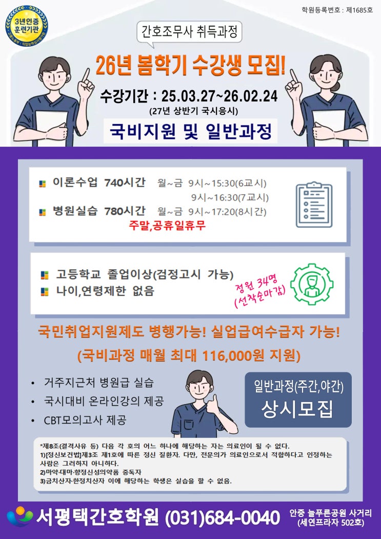 [학원정보게시] (학원법 제 15조 3항 및 시행령 제 16조의 3) 학원명: 서평택간호학원 교습 과목 및 교습과정: 간호조무사자격취득과정 목적: 학원의 설립.운영 및 과외교습에 관한 법률에 의거 간호보조기술 교육실시 학원등록번호(신고번호): 경기도평택교육지원청 등록 제1685호 주소: 평택시 안중읍 현화중앙길1 세연프라자 502호 [교육비 안내] *국비지원과정 : 개인별 자부담금 상이함(20만원~80만원내외) 교재 무상제공 *일반과정 : 월 250,000 (12개월과정) 교재비, 문제집 등 별도 *환불규정 : 학원의 설립·운영 및 과외교습에 관한 시행령-교습비등 환불규정에 따름. ※ 제8조(결격사유 등) 다음 각 호의 어느 하나에 해당하는 자는 의....... <img src="https://blogthumb.pstatic.net/MjAyNTEyMjJfNzEg/MDAxNzY2MzY2NzU1MTM4.Ih3u2V1aaygSugG0sWY2GR9N4BkOFfVt9tPlPpCHAMQg.fumkMR6QI6W41UdbQF68J_hQDRA3n7nrOJZJN6b1d9wg.JPEG/31%B1%E2%B8%F0%C1%FD%BE%C8%B3%BB.jpg?type=s3" />