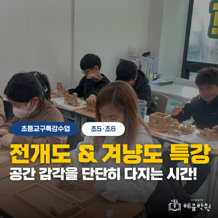 안녕하세요, 혜윰학원입니다! 초등부 아이들과 함께 진행한 전개도 & 겨냥도 특강의 복습 단계 수업 소식을 전해드립니다. 단순히 눈으로 보는 공부가 아니라, 학년별 수준에 맞춘 기초 개념 확립과 교구 탐구를 통해 공간 감각을 단단히 다지는 시간이었습니다. 학년별 맞춤 기초 개념 학습 현황 전개도와 겨냥도를 완벽히 이해하기 위해 꼭 필요한 핵심 개념들을 차근차근 학습했습니다. 초5반: 입체도형의 바탕 다지기 전개도를 이해하기 위한 기초부터 심화 입체도형의 틀을 잡았습니다. 학습 내용: 수직과 수선, 평행선 및 평행선 사이의 거리 심화 개념: 선대칭도형과 점대칭도형의 원리 입체 연결: 직육면체와 정육면....... <img src="https://blogthumb.pstatic.net/MjAyNjAxMjlfMjE3/MDAxNzY5NjY5OTc0NTIx.R5ApHgFelbDJyTePL0Vth_Hn_P2psht-hQzc6jkXsesg.RjdiY8OW2DU6K3qs_46QbY4JARM_fSJNECiG6_hhQdog.PNG/%C1%A6%B8%F1%C0%BB_%C0%D4%B7%C2%C7%D8%C1%D6%BC%BC%BF%E4_-014.png?type=s3" />