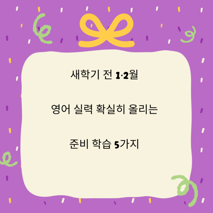 새학기 전 1·2월, 영어 실력 확실히 올리는 준비 학습 5가지️ 새학기가 시작되면 숙제, 시험, 수행평가까지 정신없이 흘러가죠. 그래서 1·2월 방학은 영어 실력을 끌어올릴 수 있는 골든타임이에요. 지금 준비하면 새학기 영어가 훨씬 수월해집니다! 1. 단어 암기, 무작정 말고 ‘레벨별’로 정리하기 영어의 기본은 역시 어휘력입니다. 방학 동안에는 욕심내기보다, • 학년별 필수 단어 • 교과서 핵심 단어 • 자주 나오는 시험 빈출 단어 이렇게 범위를 정해서 반복 학습하는 게 중요해요. 하루 20~30개씩 꾸준히 외우고, 반드시 복습 루틴을 만들어주세요. ⸻ 2. 문법은 ‘개념 + 문제 풀이’ 세트로 잡기 문법은 이해만 해도 안 되....... <img src="https://blogthumb.pstatic.net/MjAyNjAxMjlfMjg3/MDAxNzY5NjE2NjE2OTg0.iKIgOH406atGKb5eRsQlBUVuKzmddzj_0NDjZPTmUPwg.kAtTgNzbYKghzMauG3qIZtCt0NubvBoCpQhIWn7WEBkg.PNG/IMG%A3%DF5945.PNG?type=s3" />