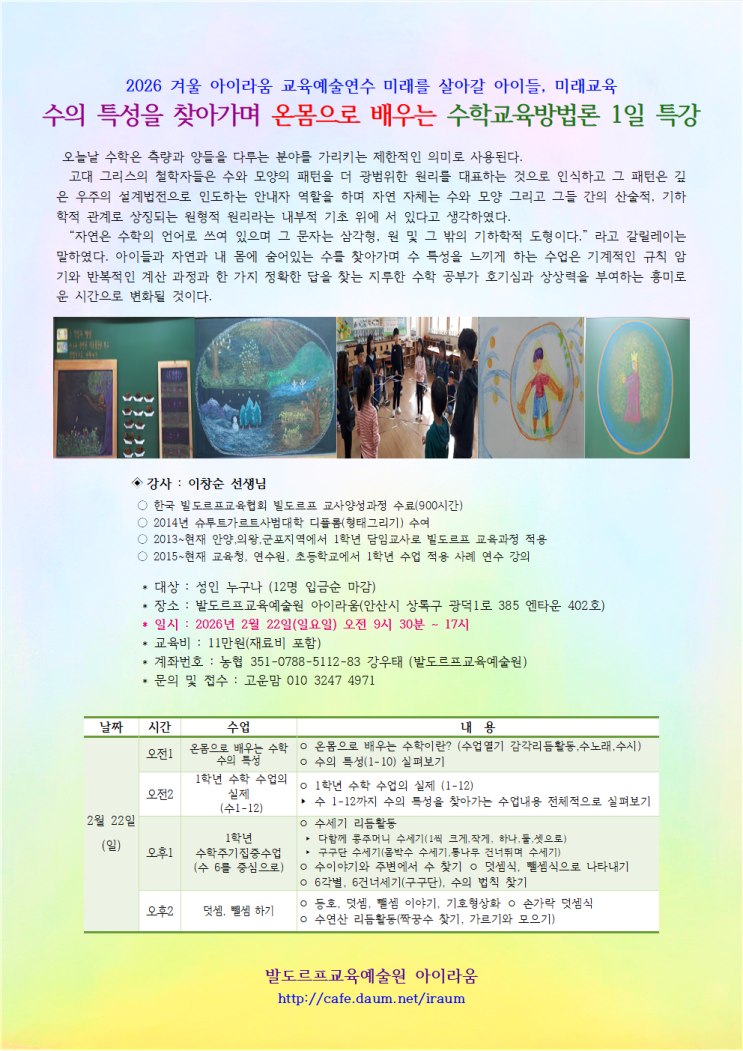 20260222(일) 아이라움 교육예술 연수-1학년 수학주기집중 수업 방법론 1일 특강 #발도르프 #감각 #교육 #슈타이너 #아이라움 #배움 #사고 #감성 #의지 #의식 #세계 #학교 #교사연수 #이야기 #노래 #그림 #발달 #수업 #아름다움 #숫자 #수세기 #1학년 #수학 #주기집중수업 #리듬활동 #환경 #신학기 #아름다움 #동화 #수업방법론 #교육과정 #특강 <img src="https://blogthumb.pstatic.net/MjAyNjAyMDRfMjE5/MDAxNzcwMTY1NzQyMDc2.EGxCjjAJwLnVUC1489MotHS8tcLR36tDavccV_uSd1kg.RPIzs_DEqdKUEQi0Gx_skilrGnARMbqib3g_BroEPHIg.PNG/20260222_1%C7%D0%B3%E2_%BC%F6%C7%D0%BC%F6%BE%F7_%B9%E6%B9%FD%B7%D0_%28%C0%CC%C3%A2%BC%F8%29001.png?type=s3" />