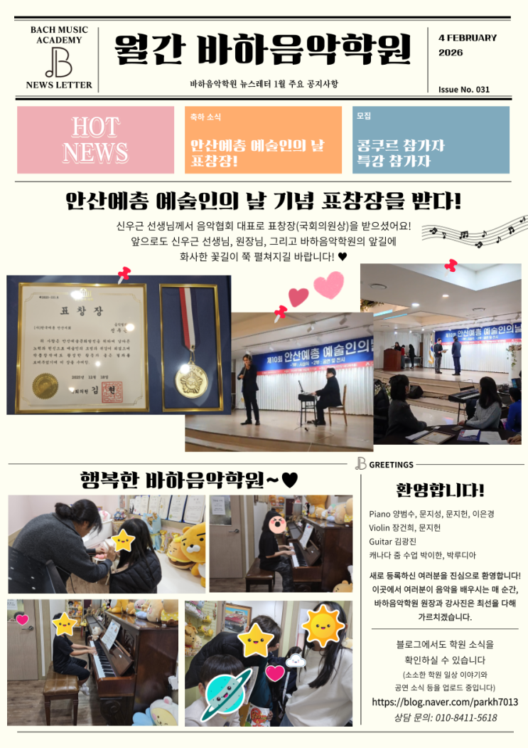 안녕하세요, 여러분!! 그동안 시간이 정말 쏜살같이 지나 벌써 2026년의 2월이 되었어요! 여러분이 정말 보고 싶었어요 ㅠ.ㅠ~~ 그동안 바하음악학원의 원장님께서 부상을 입으시고 무릎 수술을 받으셨어서 블로그 소식이 뜸했었답니다 다행히 원장님께서는 지난 주에 퇴원하셔서 이번에 신선한 소식들을 많이 들고 여러분을 찾아뵙게 되었어요~!! 남은 부상도 하루 빨리 나으시길 바라요, 원장님! 기쁜 소식과 함께하는 월간바하! 여러분도 함께 살펴 보실까요? [기쁜 소식│지난 달의 바하음악학원과 원장님!] 말씀 드렸다시피 바하음악학원 원장님께서 수술을 받으시느라 학원이 무척이나 썰렁했었어요 ㅠㅠ... 수술....... <img src="https://blogthumb.pstatic.net/MjAyNjAyMDRfNzEg/MDAxNzcwMTgyODIxODYz.JDKxSo6-5O5pP2hmhI6GEgx3OKVtJCH_JY5vNW5Wv0kg.ktSl-_apXY9XR2ZpEdXYHAOhzqdCthkdTNDln4Yn718g.PNG/%BF%F9%B0%A3%B9%D9%C7%CF-001.png?type=s3" />