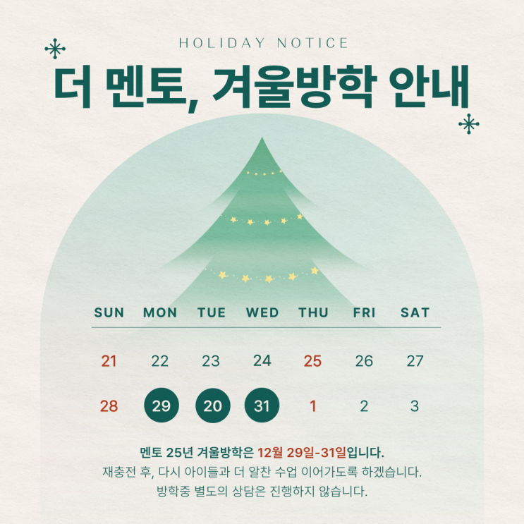 어제를 끝으로 학원내 25년 모든 시험이 종료되었습니다! 추운 날씨와 대비되게 학원은 아이들과 선생님의 열정으로 어느때보다 따듯했던 시험준비가 아니었나 싶습니다 :) 멘토는, 12월 연말 푹 쉬는 재충전의 시간을 가지고 다시 사기를 충전하여 아이들과 더 알찬 26년을 보낼 수 있도록 준비하는 시간을 갖고자 합니다. 해당 기간동안 각 과목 선생님께서는 아이들별로 '방학숙제'가 배부됩니다. 가정에서 꾸준히 복습할 수 있는 '인증시스템'을 도입하여 학습결손을 최소화 할 예정입니다. 멘토 겨울방학은, 12월 29일(월) 요일부터 31일(수)요일까지입니다! 해당기간, 별도상담은 진행되지 않으니 양해부탁드립니다 감....... <img src="https://blogthumb.pstatic.net/MjAyNTEyMThfMTk1/MDAxNzY2MDUwMjA3MTY2.XINWgUxvlSMYlQ-Rt_Wnv9iNTUqfya1eCPw4ksrNRTQg.taW1H7mDO3CRsxOQzR-5ffa5ya0tT9LBxOUXvStTd5Eg.PNG/%B8%E0%C5%E4-%B0%DC%BF%EF%B9%E6%C7%D0-001.png?type=s3" />