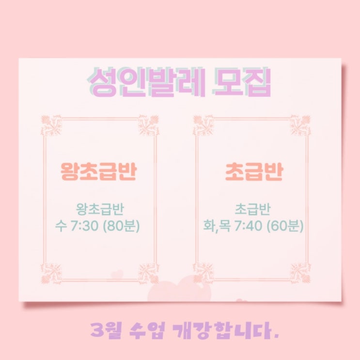 성인 발레 수업 모집합니다.~ 왕초급반 (LV0.5), 초급반(LV1) * 3월 성인 발레 수업 개설됩니다. - 왕초급반 (LV0.5) 수요일 7:30 / 80분 (오후) - 초급반 (LV1) 화, 목요일 7:40 / 60분 (오후) * 왕초급반 - 매트 (스트레칭,코어,근력강화) - 양손 바 * 초급반 - 매트 (워밍업, 스트레칭) - 한손 바 - 센터 아름답고 건강한 움직임, 발레 엘무용학원에서 함께해요.~ #안산무용학원 #안산발레학원 #선부동발레학원 #취미발레 #성인발레 #바른자세 https://www.instagram.com/p/DUF7zbCEnDj/?igsh=MW5rb2k5NGdqeGtjeA== <img src="https://blogthumb.pstatic.net/MjAyNjAxMjlfNTkg/MDAxNzY5Njg3Mzg2ODA5.P2BU_lW2n-bM_VAV-MY_YIBn8YclkKIRDyJWJEc_sjIg.YJmNHYFKZqaasQ-0mRuokwPOTHVyKPYKY6XuGb3iubMg.JPEG/900%A3%DFSNOW%A3%DF20260129%A3%DF201048%A3%DF898.jpg?type=s3" />