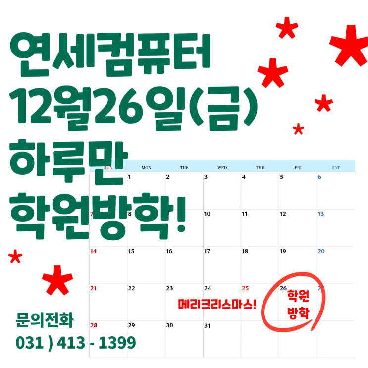12월 26일 금요일 하루만 휴강합니다 ! [ 연세컴퓨터학원 ]