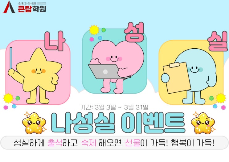 안녕하세요, 큰탑학원입니다! 벌써 4월도 중반을 넘어, 예쁜 벚꽃이 지고 푸른 잎이 돋아나고 있네요. 우리 선부동 영수학원 큰탑의 아이들도 새 학기 적응을 마치고, 이제는 본격적인 학습 궤도에 올랐습니다. ㅎㅎㅎ 저희 큰탑학원은 단순히 교과 지식만 전달하는 곳이 아니라는 점, 다들 알고 계시죠? 아이들이 공부를 지루해하지 않고, 스스로 목표를 세워 달성하는 성취감을 느끼게 해주는 것! 그것이 바로 저희 학원의 가장 큰 목표입니다. ^^ 오늘은 우리 큰탑이들을 위해 1월부터 4월까지 숨 가쁘게 달려온, 그리고 앞으로도 계속될 큰탑만의 특별한 공부 동기부여 이벤트들을 총정리해 드리려고 합니다. 이 글을 끝까지 읽으시면, 왜 큰....... <img src="https://blogthumb.pstatic.net/MjAyNjA0MDJfNzgg/MDAxNzc1MTE5ODM0NTgy.ga51S822wvFx6rrKoHG_VfXVdqxEOSxY0BJScPymftwg.TZApw1CfxHd1ipAbiiRIarQe6j1bQD7PNedx6DN0qEkg.JPEG/%B3%AA%BC%BA%BD%C7_%B0%D4%BD%C3%C6%C7.jpg?type=s3" />
