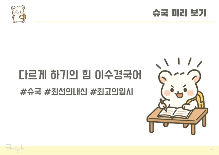 안녕하세요 :-) 2026 고1, 친구들. 이수경국어에서 수업의 주인공이 되세요. 여러분이 ‘스타’입니다. 저는 여러분의 강력한 팬클럽 회장이 될게요. 올 한해 반짝 반짝 빛날 준비가 되셨나요? 지금 가장 필요한 것들로 채웠습니다. 1. 내신 국어, 수능 국어 이수경국어는 대학 입시에서 꼭 필요한 네 가지 중 내신 국어와 수능 국어를 담당하는 학원입니다. 2. 수능 국어를 기반으로 한 최선의 내신 위 시험지는 화정고등학교 1학년 2025년 1학기 중간고사입니다. - 외부 지문이 출제되는 문학 - 모의고사를 반영하는 독서 - 원리와 예문을 함께 적용하는 문법 보시다시피 모두 수능 국어의 능력을 필요로 합니다. 이수경 국어는 수능 국어 학습....... <img src="https://blogthumb.pstatic.net/MjAyNTEyMTNfMTIy/MDAxNzY1NTU2NDgyNTAy.zDKaguSW605YHV99-B85qjaefGMf51mOTNYekb-d0Bwg.g4TqnExSOTBrf30kSD5Dw_-s0GjXCMH4XHw-JB0Jur4g.JPEG/IMG%A3%DF5416.JPG?type=s3" />