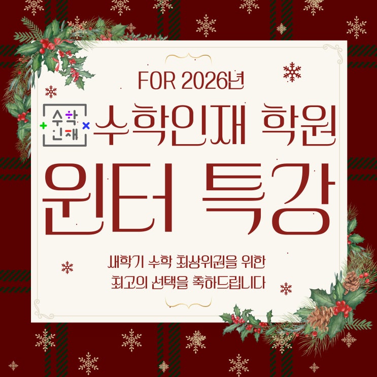 ️삼송수학인재 학원 2026 수학 최상위권을 위한 [️수학인재 : 초,중,고 윈터특강 안내]입니다. -️삼송수학? 이제 수학인재 학원입니다- -️수학인재 강사진은 다릅니다 - -️2025 중/고등부 각 학교 지필평가 만점자&상위권 다수 배출- 안녕하세요 :) 티칭과 코칭의 조화! 초중고 수학 전문 수학인재학원입니다. 아래의 개요를 바탕으로 [2026년 초,중,고 윈터특강 안내] 를 소개해 드리겠습니다. 이제, 2026 수학 최상위권을 시작! [2026년 초,중,고 윈터특강]을 자세히 알아보시겠습니다. 특강 01. 예비초3-6 [금] 추가 개인 진도 수업 [추가 안내] 1. 모집 정원: 6명 2. 모집 기간: 1월 7일 (금)까지 특강 02........ <img src="https://blogthumb.pstatic.net/MjAyNTEyMTZfMTA5/MDAxNzY1ODk0OTE3MjIy.8e4pTtphFhwDt_q5WJywuOsCHhOnMjpNfdDZLo3EDk4g.1XX8Do8GkY-7NUF6wVj9VBfWTVTycyhinf22WonwOmkg.JPEG/2026-%C0%A9%C5%CD%C6%AF%B0%AD_%BA%B9%BB%E7%BA%BB-002.jpg?type=s3" />