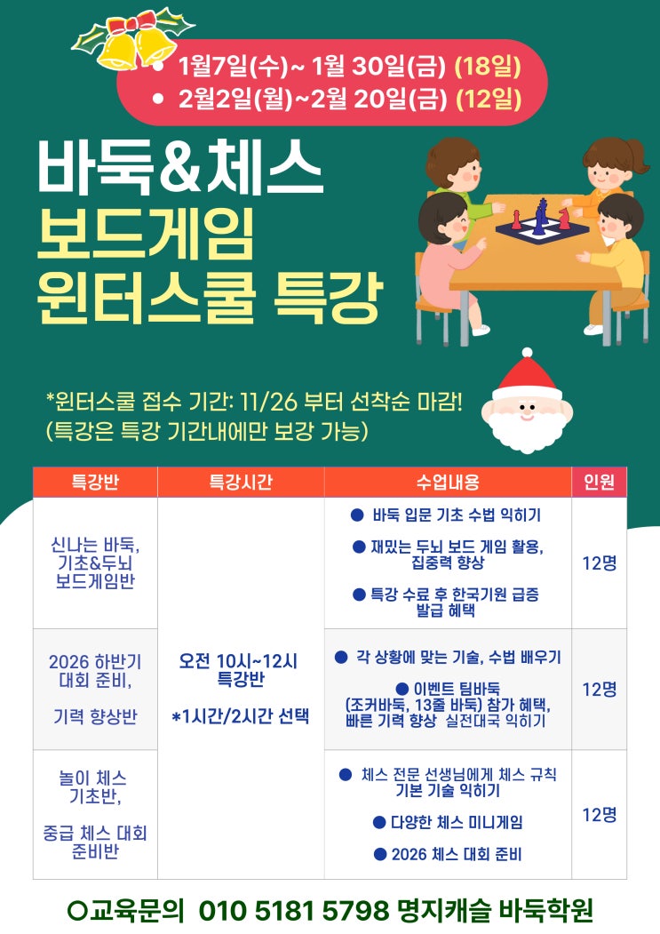 명지캐슬바둑학원 겨울방학 특강 OPEN! 바둑 & 체스 & 보드게임으로 겨울방학을 알차게! 겨울방학, 아이에게 의미 있는 성장의 시간을 만들어주고 싶으신가요? 명지캐슬바둑학원에서는 이번 겨울방학을 맞아 바둑 · 체스 · 두뇌 보드게임을 함께 배우는 윈터스쿨 특강을 진행합니다. ❄️ 겨울 특강 기간 안내 ✔ 1차 특강 1월 7일(수) ~ 1월 30일(금) (총 18일) ✔ 2차 특강 2월 2일(월) ~ 2월 20일(금) (총 12일) 선착순 마감 ※ 특강은 특강 기간 내에만 보강 가능합니다. ♟️ 특강 프로그램 소개 ① 신나는 바둑 & 기초 두뇌 보드게임반 바둑 입문부터 기초 수법까지 차근차근 학습 재미있는 두뇌 보....... <img src="https://blogthumb.pstatic.net/MjAyNTEyMTdfMTQg/MDAxNzY1OTQ4ODU1MTc3.NNyBcra86gO080Yc9tycl0Wme67MAadOldvHflNcT3sg.36vgDW6Ec1Zn8oJYZme_F6uzqHa9zfW8rWnoBY7sJ9Yg.JPEG/%B9%E6%C7%D0.jpg?type=s3" />