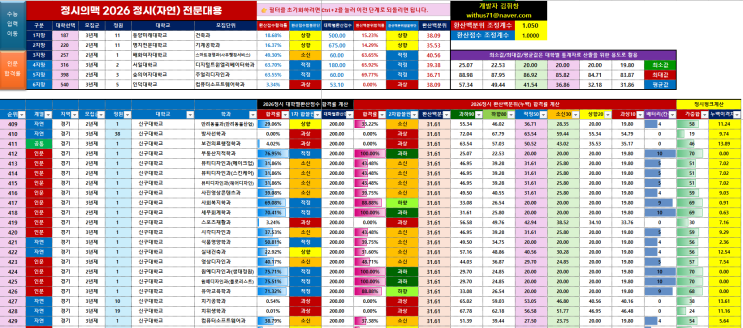 2026정시지원전략 - 맥에듀테크 정시 전문대용 합격률 계산기 “정시 성적이 낮아도, 전략은 포기하지 않는다” 수능 성적이 기대에 못 미쳤다고 해서 인생의 선택지가 사라지는 것은 아닙니다. 문제는 정보와 전략이 없을 때 발생합니다. 그래서 저희 맥에듀테크는 정시 성적이 낮은 학생들을 위한 전문대 전용 합격률 계산기를 개발·보급합니다. 왜 반드시 필요한가? 1️⃣ 가·나·다군이 끝이 아니다 정시는 가·나·다군이 전부가 아닙니다. 전문대 지원은 장수 제한이 없는 ‘번외 카드’ 입니다. ✔️ 원서 몇 장 남겨두고 끝내는 게임이 아니라 ✔️ 끝까지 선택지를 열어두는 확률 게임입니다. 이 계산기는 그 마지막 확률을 잡기....... <img src="https://blogthumb.pstatic.net/MjAyNTEyMjRfMTQ4/MDAxNzY2NTYxNzExMDA2.roUZ3xNH9EGmRgrjFQb1ixZ6ndgbo1B-8CJ1kZdFWdcg.N2beq2TzEuKOm-_pKJt3Gm85SU_ZG-rjByTbqg_i_9wg.PNG/20251224_163428.png?type=s3" />