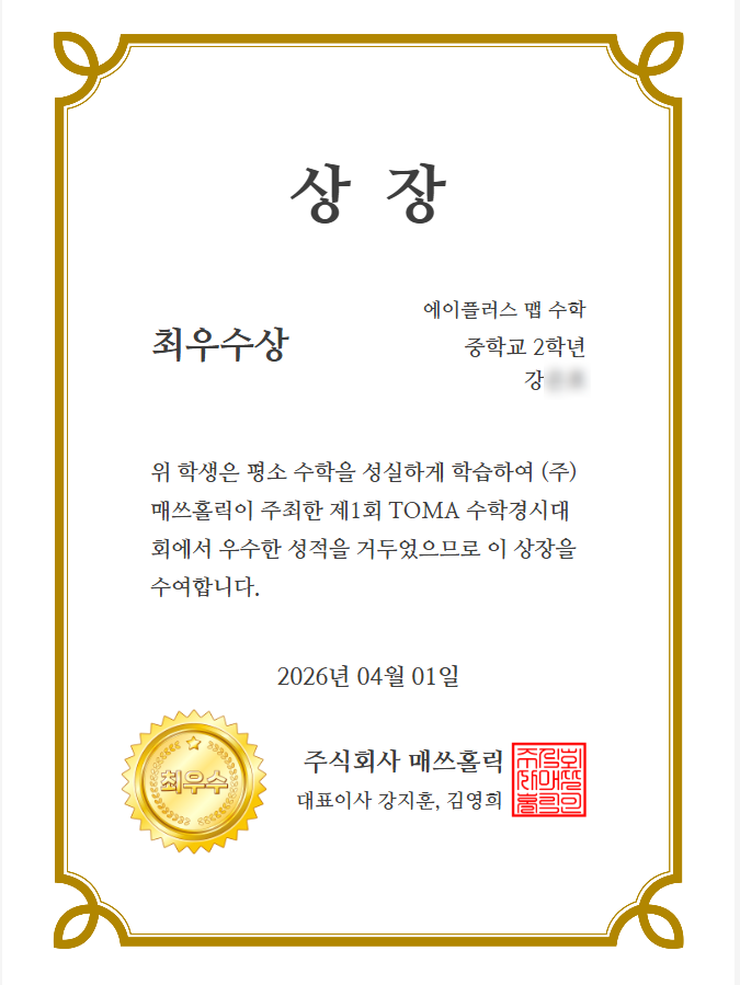 [향동수학학원][에이플러스맵수학] TOMA 경시 대회 결과
