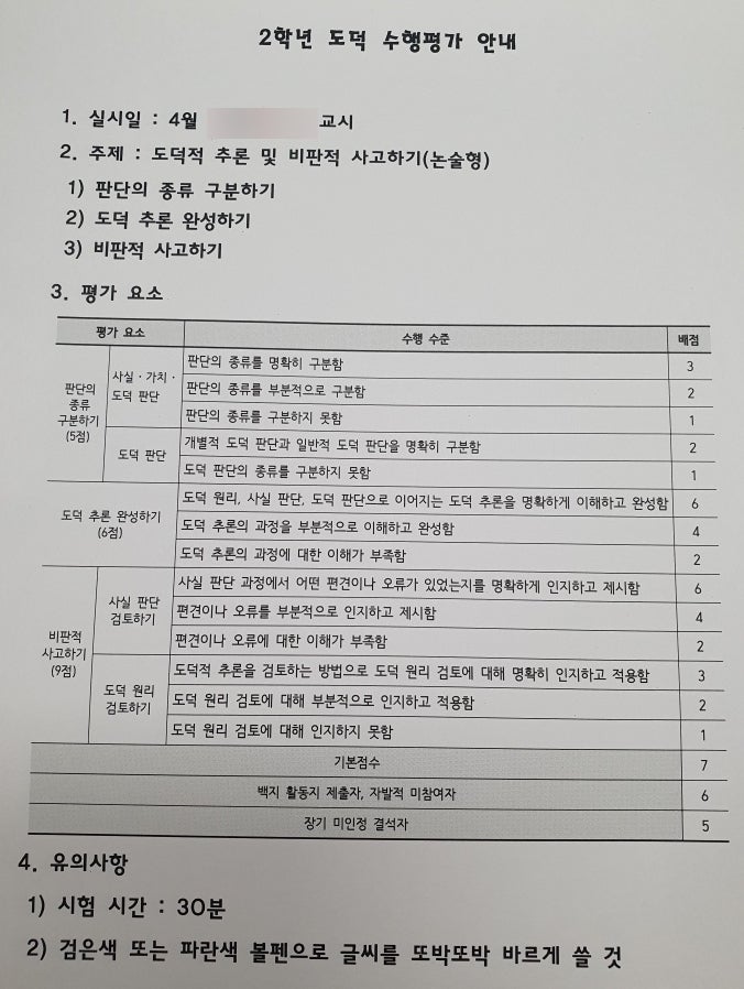 안녕하세요^^ 임연희 국어전문 독서논술 학원입니다. 중고등부 학생들에게 봄과 함께 찾아오는 것은 벚꽃이 아니라 논술형 수행평가 공지와 1차 정기시험범위 인 것 같습니다. 행신중 2학년 1학기 논술형 수행평가도 매주 공지되고 있어서 이번 한 주간은 내신범위 학습과 전과목 논술형 수행평가 대비로 너무 바쁜 주말입니다. 행신중 2학년 논술형 수행평가 중에서 도덕 수행평가는 난이도가 매우 높은 분석 통합형 논술평가 입니다. 행신중 수행평가 특징 난이도 높은 이유는 논술형 중심 과정 평가 (추론 과정까지) 비판적 사고 요구 개념 + 적용 + 분석 통합 다른 학교 수행평가와 비교 분석 ✔ 일반적인 중학교 도덕 수행평가 서술형 + 선....... <img src="https://blogthumb.pstatic.net/MjAyNjA0MDRfMTgz/MDAxNzc1MzA0NDU1NTEx.EYZsmsITiezAPugKp19Lk-D96roiCsuSdMqZM5J4Ra8g.hTiKYpnyDD7HVKuGfBZciMHLU8ZLfkfpkF-x4glN6Q0g.JPEG/KakaoTalk_20260404_205625049.jpg?type=s3" />