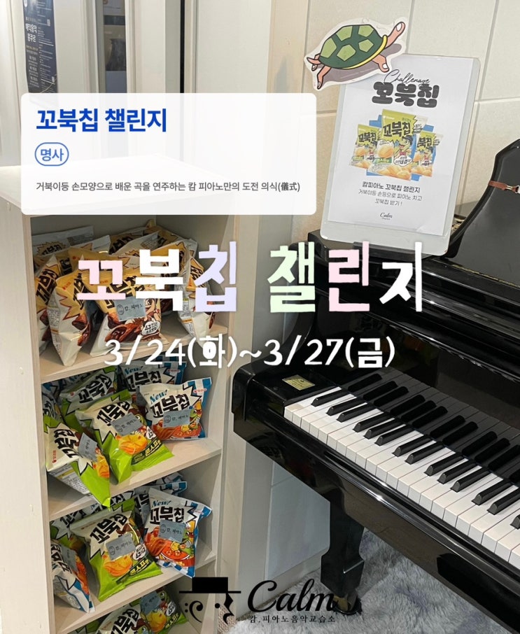 작년에 이어 올해도 캄 피아노의 전매 특허(?) 꼬북칩 챌린지를 하고 있습니다 꼬북칩 못 받아가는 친구들 없길 바라며 넉넉히 준비해뒀어요. 그런데요. 사실 선생님의 진짜 바람은 따로 있어요. 얼마전에 읽은 시몬 베유의 책 <중력과 은총>에서 크게 감명 받은 부분이 있었어요. 보상을 바라지 않고 열심히 할 수 있을 떄, 비로소 '진짜'가 채워진다. 이런 내용이었는데요.. 과자가 없어도, 칭찬이 없어도, 건반 앞에 앉고 싶은 날이 오는 것 그게 제가 아이들에게 진짜 주고 싶은 거랍니다!!!!! 저도 그렇게 살고 싶고요. (인생 추구미 정말 진심으로 열심히 할 일을 하지만, 그 무엇도 바라지 않는. 캬-) 근데 우리....... <img src="https://blogthumb.pstatic.net/MjAyNjAzMjVfMjc1/MDAxNzc0NDE4OTY3Njg1.GyoriTxKbUDZPsu6mxfFHyQuurq8x-pWiZ5xIToLfMIg.A0HtSIgU1DhHOxaXu6Lte9l7akJxZ1KuJmxqHzxNwUcg.JPEG/IMG%A3%DF4485.JPG?type=s3" />