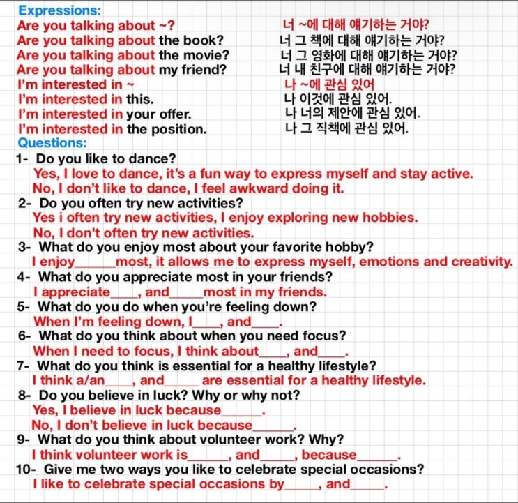 안녕하세요. 처음 만나거나 어색한 사이일 땐 무슨 얘기를 하면 좋을지 고민일 때가 있죠. 오늘은 Small talk, Ice breaking 하기 좋은 영어질문과 그 대답에 대해 알아 보겠습니다! * 개인적인 질문과 대답 Do you like to cook? 요리하는 거 좋아하세요? Do you have any pets? 애완동물 기르세요? What was the last book you read? 가장 최근에 읽은 책이 뭐에요? Which color do you like? 무슨 색을 좋아해요? I like yellow best. 노란색을 가장 좋아해요. Which sport do you like? 어떤 운동을 좋아해요? I don't like sports, but I like to watch soccer game. 전 운동을 좋아하진 않지만 축구경기를 보는 것을 좋아해요. Have y....... <img src="https://blogthumb.pstatic.net/MjAyNjAzMjdfMTgw/MDAxNzc0NjE1NjMyMzM2.P9Owpx49h1wh2dHraRo8IieTJYQEyuYUpxcjINNul9sg.cbs3JcO3xkVBaERcrZ1s3paWbRgBJzI_4B-Q60D7ooUg.JPEG/How_to_Not_Almost_Break_Up_With_Your_Future_Spouse.jpg?type=s3" />