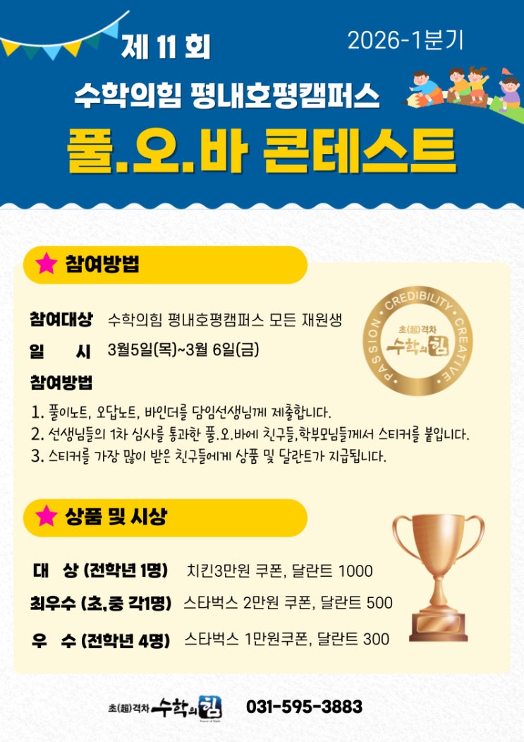 제11회 풀오바(풀이노트·오답노트) 콘테스트 수학의힘 평내호평캠퍼스 입니다. 우리 학원에서는 학생들의 풀이노트와 오답노트 습관을 키우기 위해 '풀오바 콘테스트'를 진행중입니다. 먼저 '풀오바 콘테스트'에 대해 안내드리겠습니다. 풀오바 콘테스트란 ? 풀오바는 풀이노트 + 오답노트의 줄임말입니다. 풀이노트 : 문제 해결 과정을 단계별로 정리하는 노트 오답노트 : 틀린 문제를 분석하고 올바른 해결 방법을 다시 기록하는 노트 풀이노트와 오답노트는 서술 능력 함양과 철저한 관리를 위하여 선생님들이 매일 노트를 확인하시고 최현숙 원장님이 직접 3개월에 한번 씩 정기적으로 검사를 실시합니다. 일관....... <img src="https://blogthumb.pstatic.net/MjAyNjAzMTNfMTM1/MDAxNzczMzk1NDQzMzA1.KC52AINtIw82EFsIEV8nk4RwyQoCOZDkJSzWu3SLayQg.nI25-WwJSdtSM8LQGuIKuX1EIeLdkWQD-kYFdSvdLsUg.JPEG/%C1%A6%B8%F1%C0%BB-%C0%D4%B7%C2%C7%D8%C1%D6%BC%BC%BF%E4_-001_-_2026-03-04T160544.551.jpg?type=s3" />