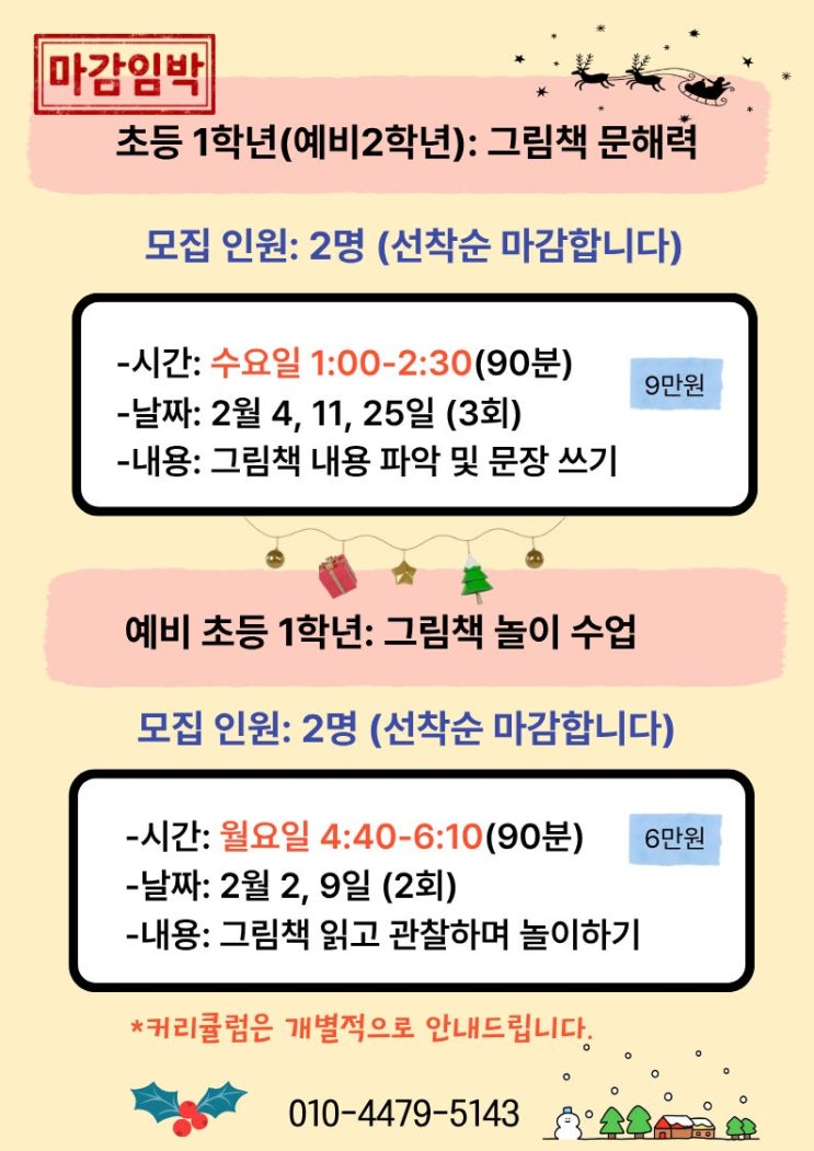 [2월 특강 모집] 예비 초등1학년, 2학년 모집(각 2명씩)