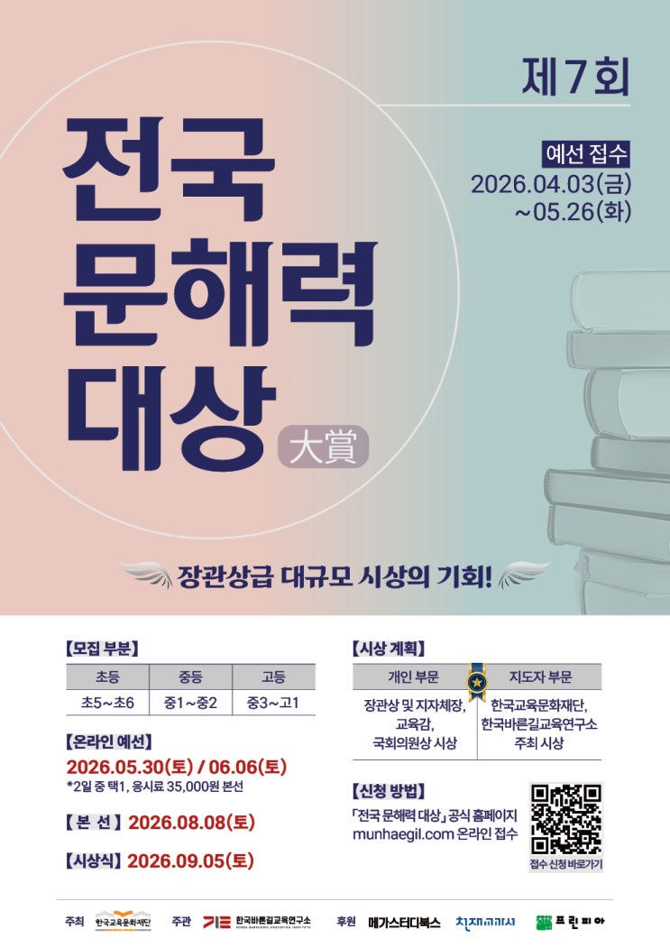 2026년 상반기 제7회 문해력 테스트 지난 해까지 전국 국어학원 연합으로 실시되던 '문해력 테스트'가 더 크게 발전했습니다. 예선 접수 : 4월 3일(금)~5월 26일(화) 온라인 예선 : 5월 30일(토) / 6월 6일(토) 응시료 : 35,000원(예선 접수 시 납부) 본선 : 2026년 8월 8일(토) 서울교육대학교 사향융합체육관 시상식 : 2026년 9월 5일(토) 국회도서관 대강당 시상 내역 : 장관상 / 지자체상 / 교육감상 / 국회의원상 등 영어 '레테'는 당연하게 생각하면서 국어 능력 곧 문해력에 대해서는 무심한 경우가 많습니다. 전과목 학습 능력으로 연결되는 문해력, 우리 아이들의 문해력을 확인해 볼 수 있고 또 나의 문해력을 뽐....... <img src="https://blogthumb.pstatic.net/MjAyNjA0MDNfMTk5/MDAxNzc1MjI2Nzc2Njg5.9jARbO3xBlIY2xf98iu6eYxN9RiHihFBcQoh4CrjA_8g.WMGPfQiT6Krq5MnY8N3YB6GbjYzNDsii-MwBDYvS7cwg.JPEG/%C1%A67%C8%B8%C0%FC%B1%B9%B9%AE%C7%D8%B7%C2%B4%EB%BB%F3.jpg?type=s3" />