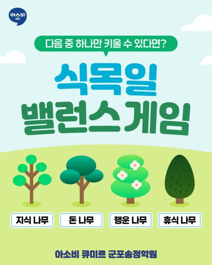 안녕하세요~ 아소비 큐미르 군포송정학원입니다 식목일 밸런스 게임 EVENT 4월 5일은 식목일 나무를 심으며 자연의 소중함을 생각해 보는 날인데요. 아소비에서 식목일을 맞아 재미있는 밸런스 게임 이벤트를 준비했어요! 하나만 키울 수 있다면 어떤 나무를 선택하시겠어요? 지식 나무 뭐든 배우면 바로 이해됨 돈 나무 통장에 돈이 계속 자람 휴식 나무 피곤이 자동 회복 행운 나무 운이 계속 따라다님 ️ 아래 블로그에 댓글로 하나만 선택해 주세요! 이벤트 기간 4월 2일 ~ 4월 30일 참여 방법 1. 아소비 이웃 추가 2. 키우고 싶은 나무 하나만 골라서 댓글로 적기 이벤트 경품 (총 20명....... <img src="https://blogthumb.pstatic.net/MjAyNjA0MDNfNTAg/MDAxNzc1MjAxMzg4MzA0.LAL1KOuQJMlCqJT08KEsgcDvSMDafYRUCWiFaZBBX7Qg.Z7fGrNRaLlAIUsVB0PGASFxtfukqYjK_Ezc4a_4ii78g.JPEG/%C1%A6%B8%F1%C0%BB_%C0%D4%B7%C2%C7%D8%C1%D6%BC%BC%BF%E4..jpg?type=s3" />