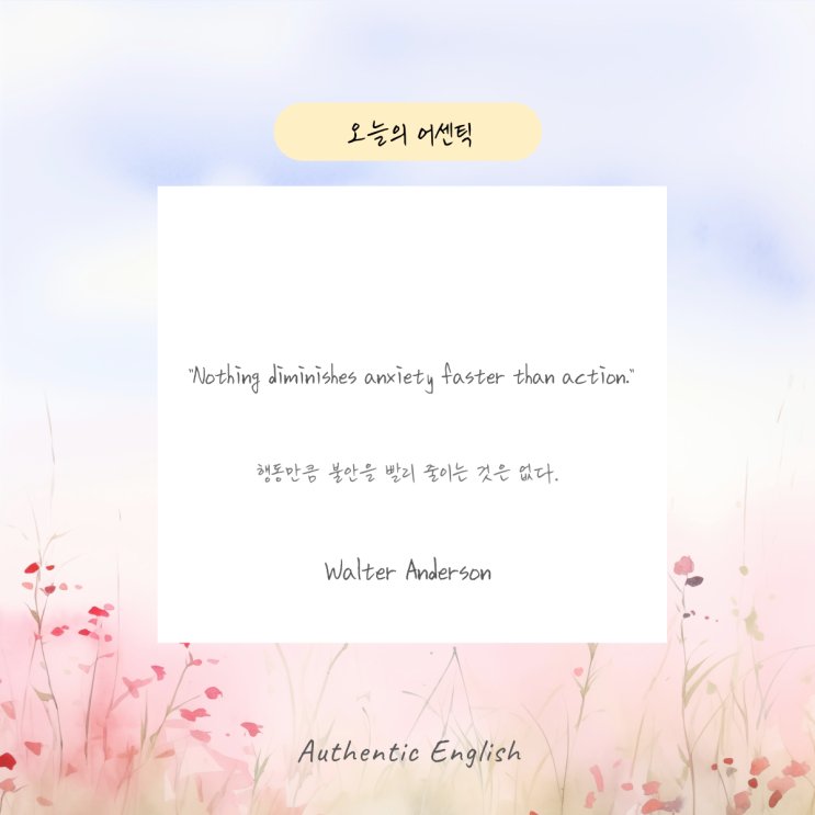 “Nothing diminishes anxiety faster than action.” 행동만큼 불안을 빨리 줄이는 것은 없다. Walter Anderson <img src="https://blogthumb.pstatic.net/MjAyNjAzMjhfMjQ4/MDAxNzc0NjgwOTgwMzYz.LA1ia4OM3qTWPPjAWEKRqE7zN983eVVQCCWuHQCP20Ag.rCwP3OppF9TGURPzEBhVzioZ6NT2BbhtyBqwHc-8ke4g.PNG/005.png?type=s3" />