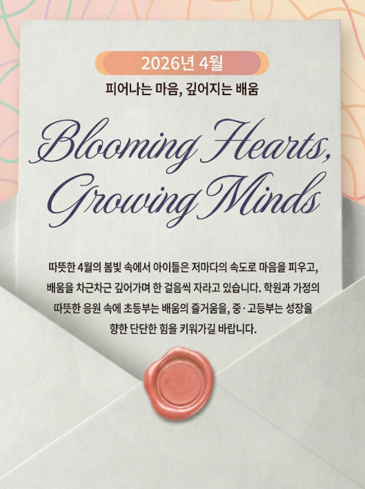 안녕하세요, 학부모님. 따뜻한 햇살이 창가에 머물고, 부드러운 봄바람이 하루하루를 포근하게 감싸는 4월입니다. 어느새 거리에는 꽃이 피어나고, 연둣빛 새잎이 조용히 계절의 변화를 전하고 있습니다. 이렇게 봄이 천천히 우리 곁에 스며들 듯, 아이들의 마음과 생각도 조금씩 자라나고 있습니다. 눈에 띄게 드러나는 변화가 아니더라도, 아이들은 저마다의 속도로 오늘을 배우고 내일을 준비하며 한 걸음씩 성장하고 있습니다. 이 따뜻한 계절 속에서 아이들의 가능성 또한 더욱 선명하게 피어나기를 바라는 마음입니다. 초등부 아이들에게 4월은 새로운 환경에 조금씩 익숙해지며 배움의 기초를 차곡차곡 쌓아가는 소중한 시간입니다. 아직....... <img src="https://blogthumb.pstatic.net/MjAyNjA0MDJfMTE3/MDAxNzc1MTAxNjQ1MDQ3.3NEu2yvLbHbWXSb0PHmTKpWoj1THTHnQAAAIDmeNe1gg.ceL8n84DyrQKLZH8GBeAViXPKMTwLwLHh4WWCf3QZvEg.PNG/image.png?type=s3" />